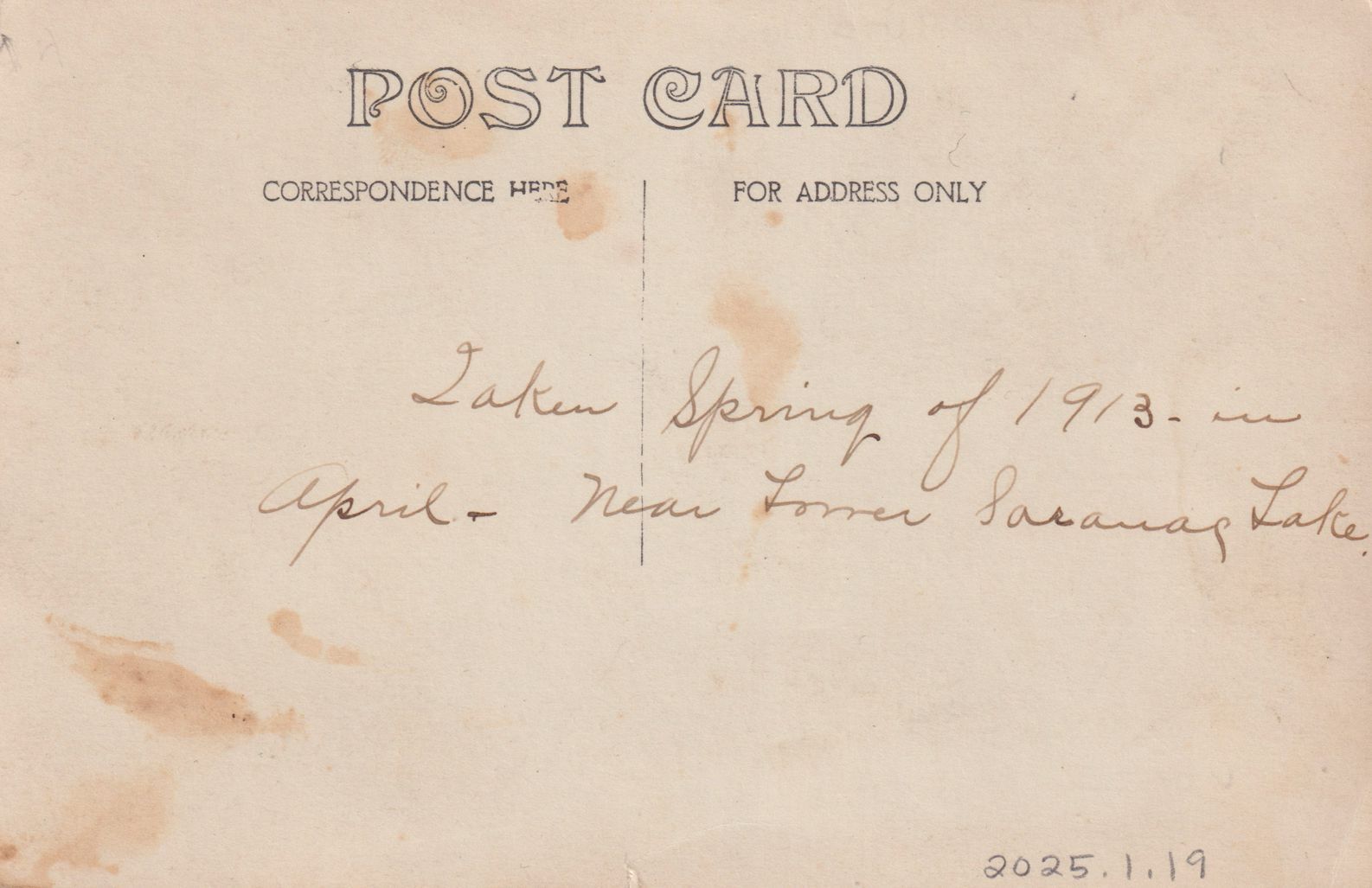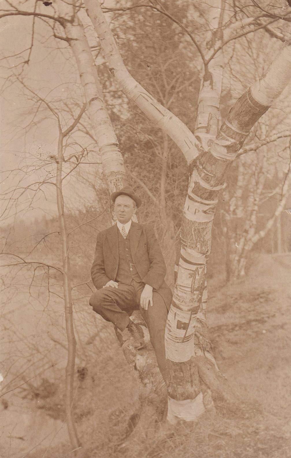 Black-and-White photograph postcard of an unidentified man in a suit sitting in the "v" or crotch of a birch tree. No photographer's mark. Unused, divided back. Handwritten note on reverse reads, "Taken Spring of 1913 in April - Near Lower Saranac Lake."