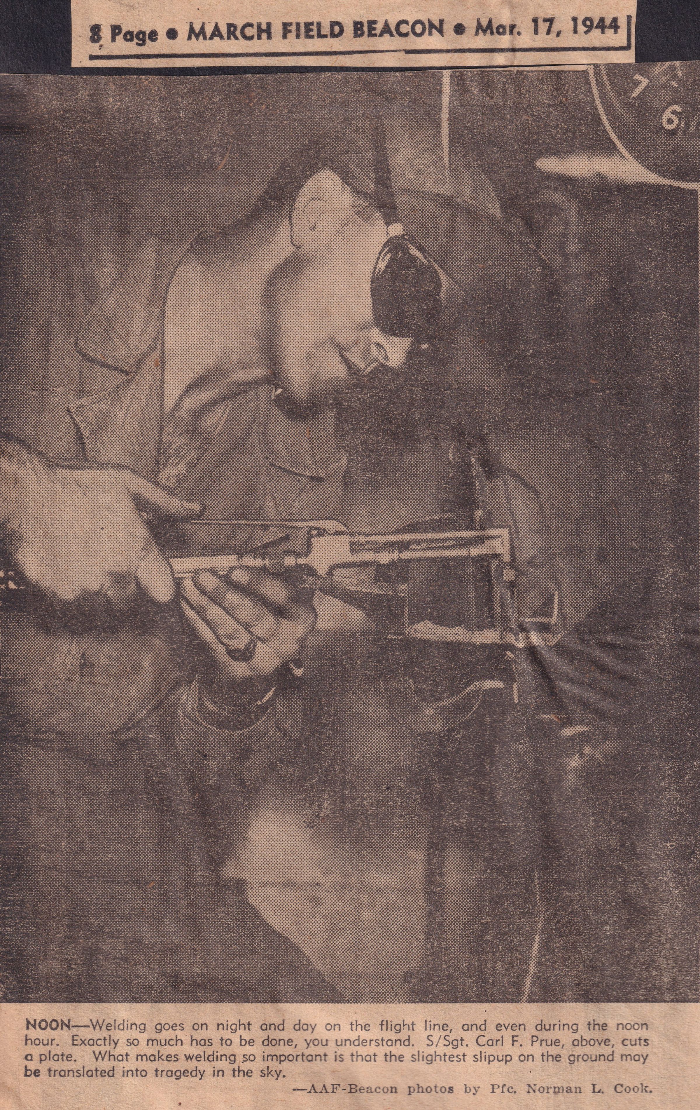 Newspaper clipping from the March Field Beacon, March 17, 1944, with a photograph of Carl Prue welding during his military service.