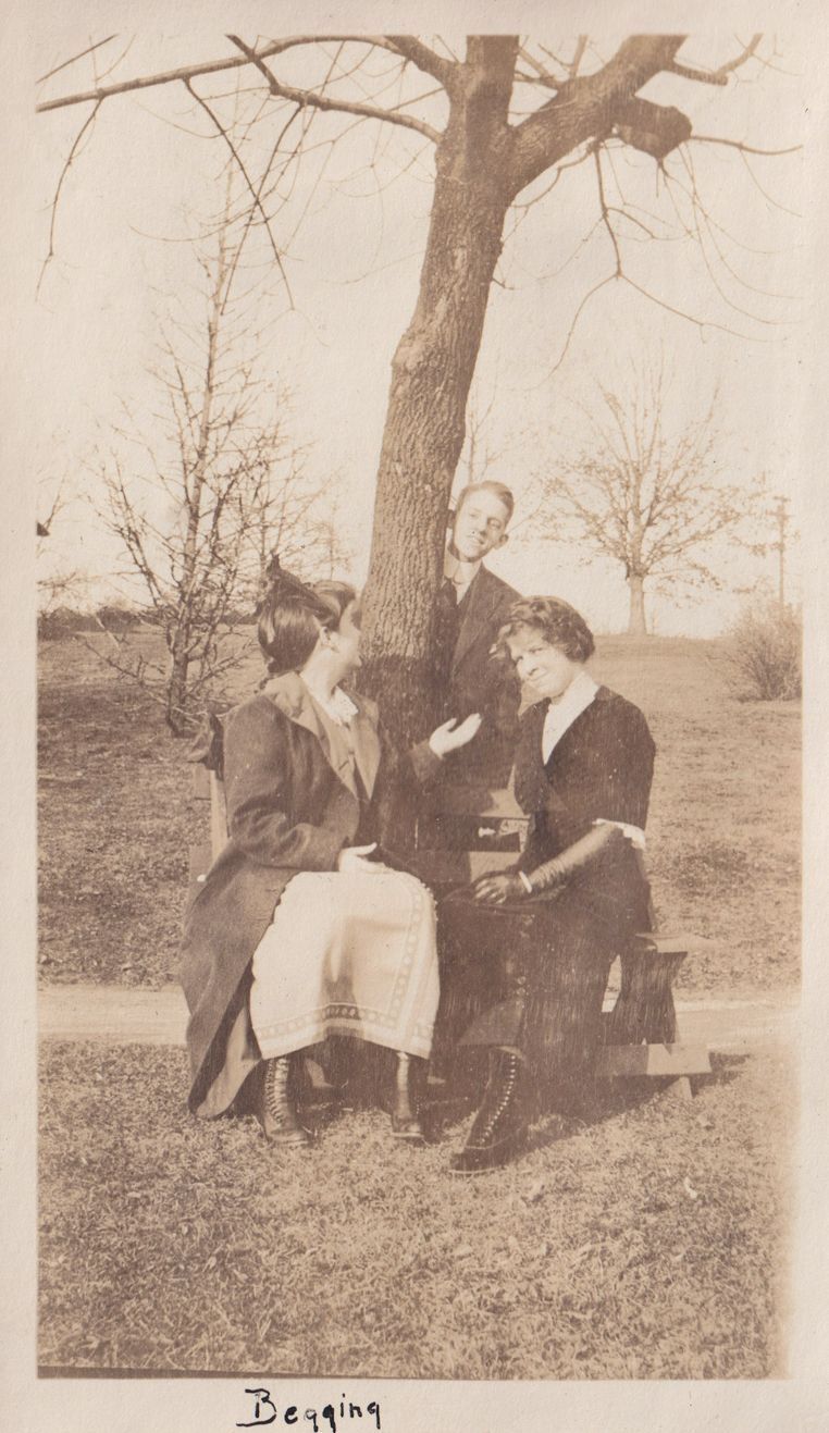 Black-and-white photograph of two women sitting on a bench in front of a tree. There is a man standing behind the tree and one of the women is looking and gesturing at him. "Begging" is written in ink beneath the photograph.