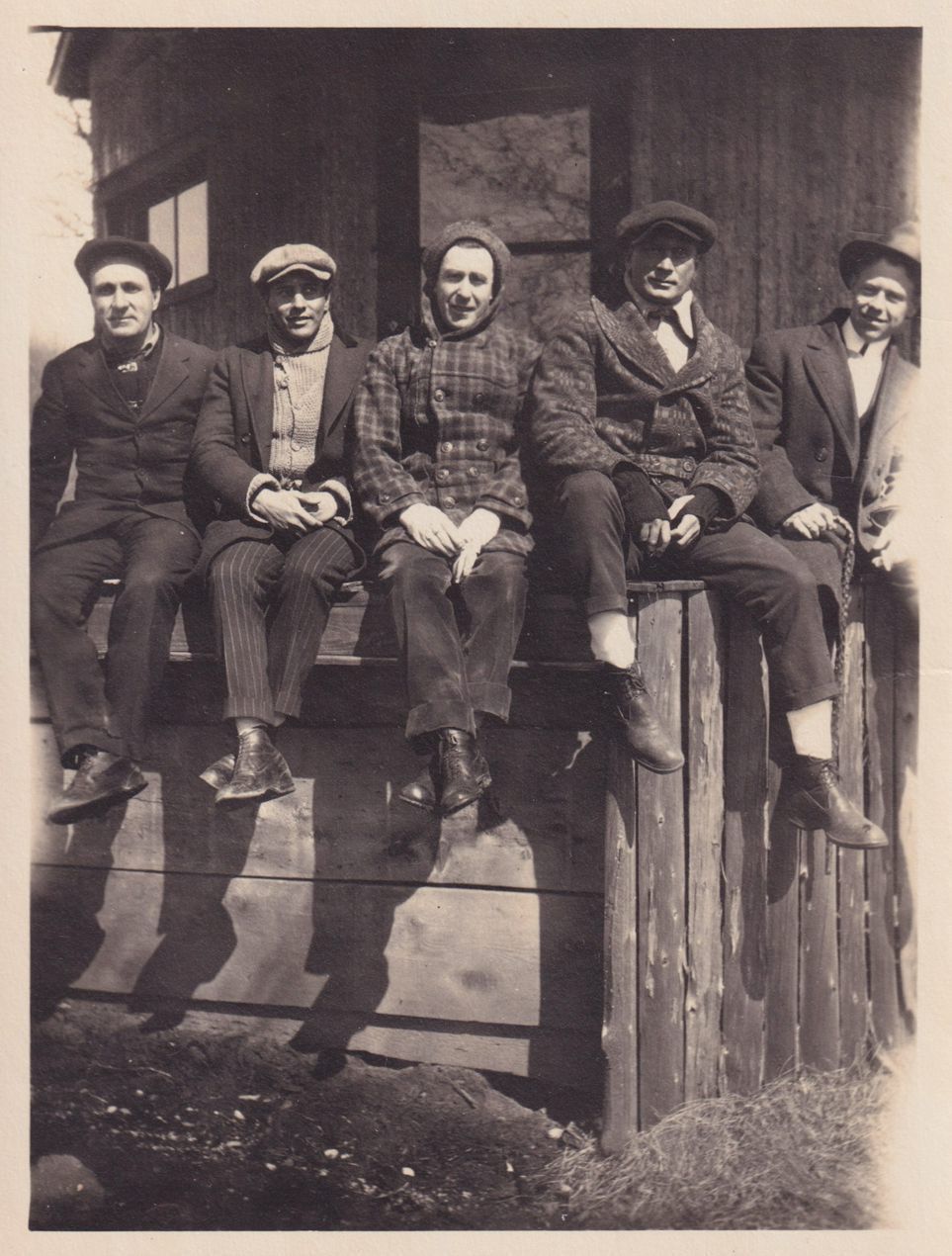 Black-and-White photograph of a group of unidentified men sitting on a wooden porch or retaining wall. They are all wearing hats and winter jackets. The photograph was likely printed by Kollecker's Kodak and Gift Shop.