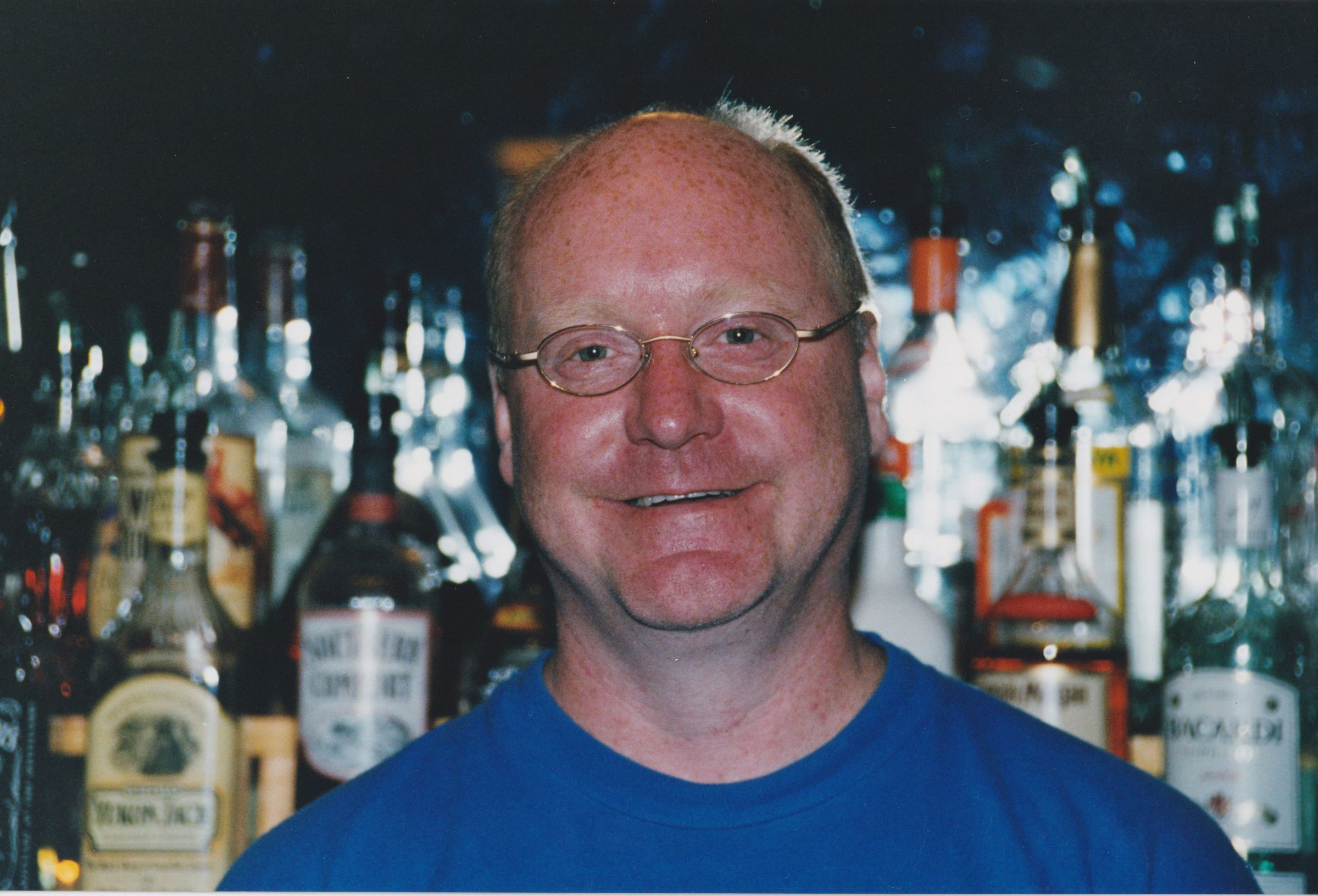 Color photograph of Kyle Munn in front of a shelf of alcoholic spirits inside of his business, Snuffy's Pub. Portrait taken by Mary Lou Hanpeter Banks as part of her Soul Proprietor exhibition.