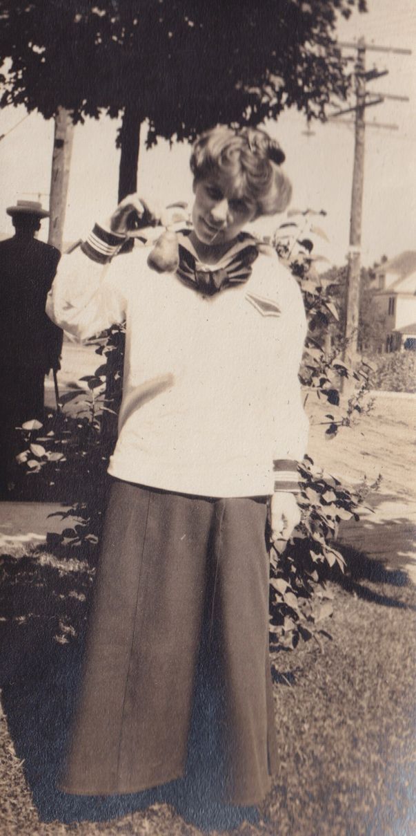 Black-and-white photograph of a woman standing outside at the edge of a lawn holding a pear. There is a tree and man standing behind her.
