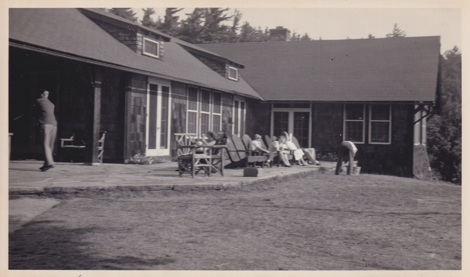 Black-and-White photograph of an unidentified building at Pyramid Camp (AKA Bartlett Carry Club). Several people can be seen sitting on the porch.
