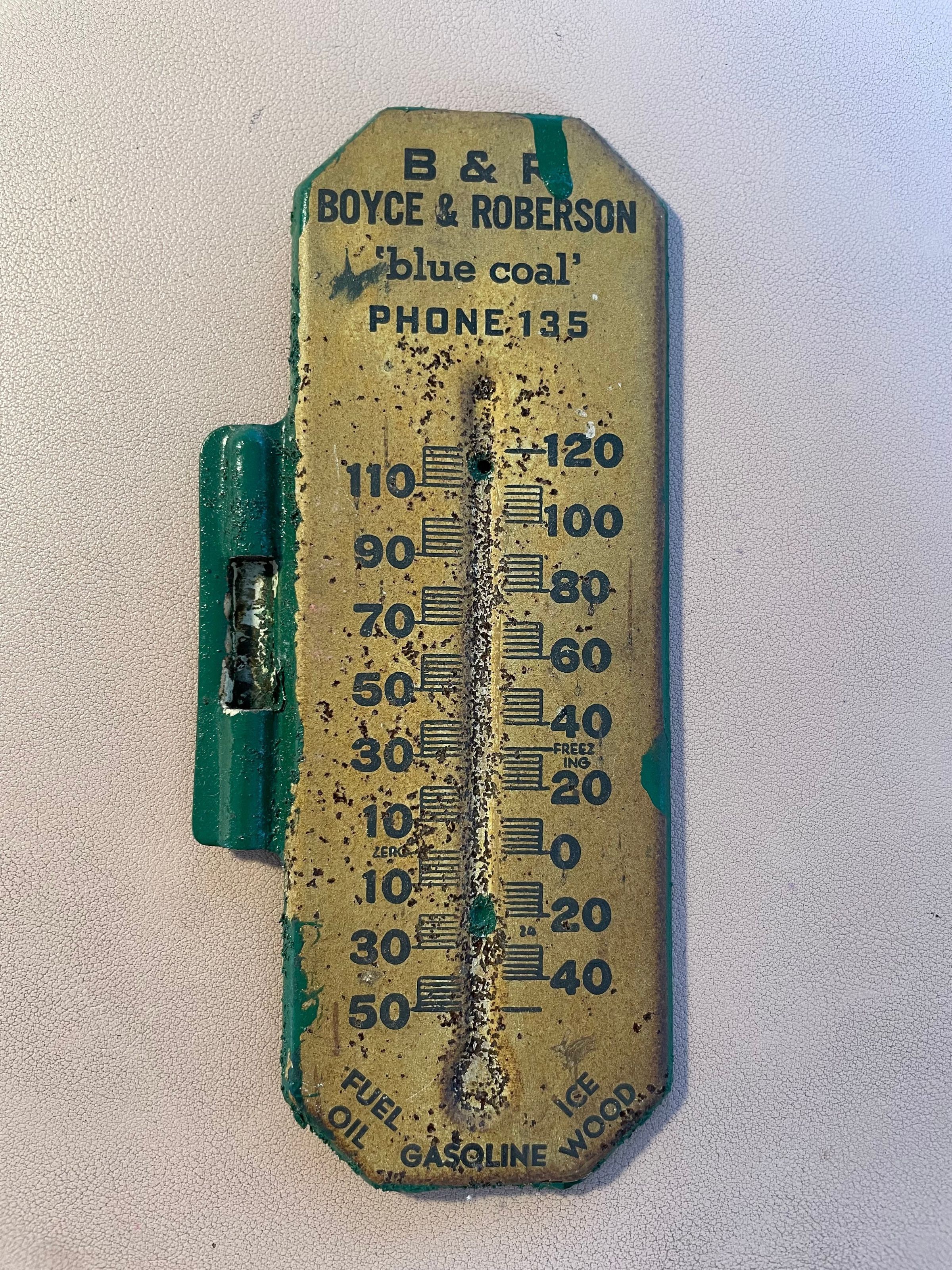 Metal thermometer advertising Boyce & Roberson [thermometer is missing]. Metal plate reads, "B&R. Boyce & Roberson. 'blue coal.' Phone 315. Fuel oil, gasoline, ice, wood." Has a slot at left side, probably for mounting.Lexicon