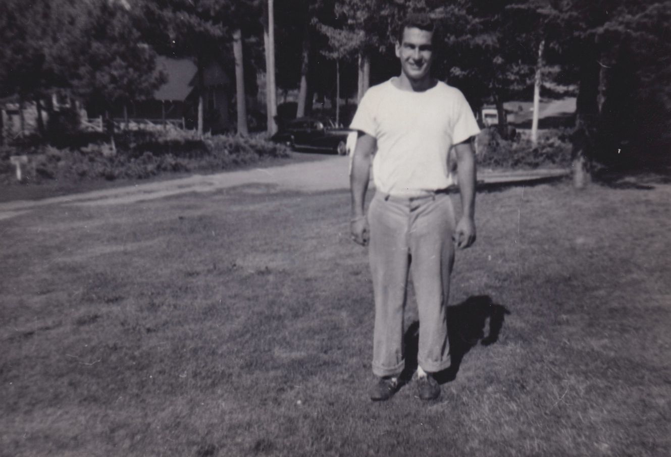Black-and-White photograph of a man standing outdoors at Pyramid Camp (AKA Bartlett Carry Club). Handwritten note on reverse reads, "Dick Rosa. 52."
