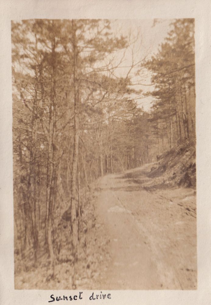 Black-and-white photograph of a dirt road curving through a wooded area with an incline on one side. "Sunset drive" is written in ink beneath the photograph.
