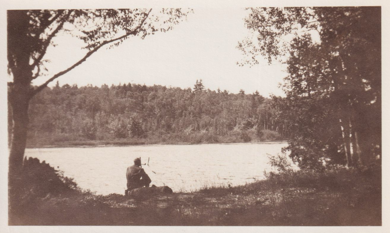 Black-and-White photograph of a man smoking a pipe on the edge of a body of water at Bartlett Carry Club. "July 25, 1932," is stamped on reverse.