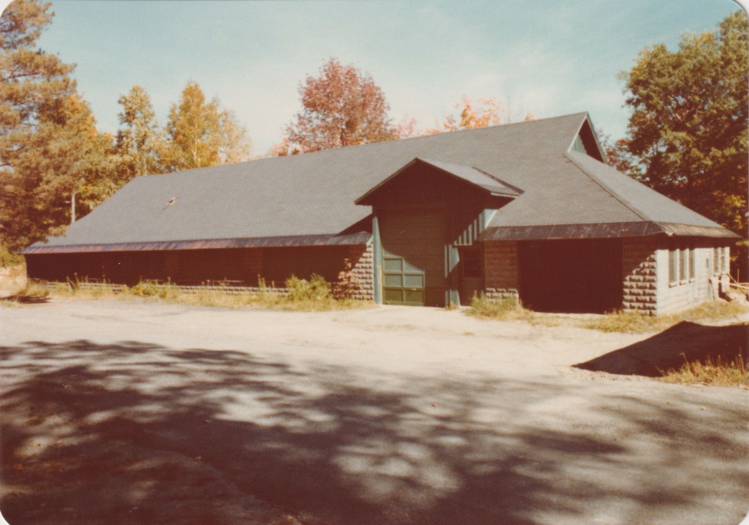 Color photograph of a brick building with two large doors, previously the Fireproof Laundry of Trudeau Sanatorium, but part of the American Management Association grounds at the time of this photograph.