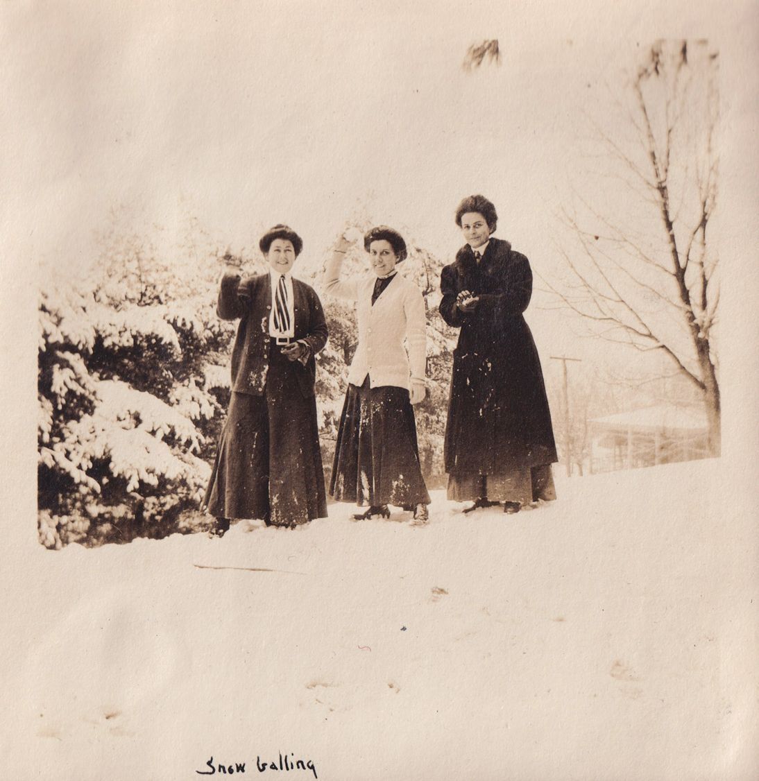 Black-and-white photograph of three women standing on snowy ground, each holding a snowball in her hands. Two of them are posing as if to throw their snowball at the photographer. "Snow balling" is written in ink beneath the photograph.