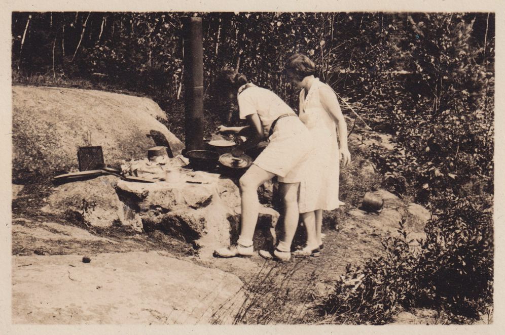 Black-and-White photograph of Amy Jones and an unidentified woman cooking at a state campsite. Part of album 2024.21.1, kept by Amy Jones and David Blair Jones c. 1930-1934.