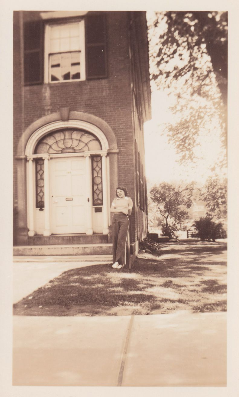 Black-and-White photograph of a woman leaning against the corner of a brick building. The building has a large door with arched leaded glass windows. Was in an envelope marked, "Hoffman, Monday Jul 12 1937." Photograph was developed by Kollecker's Kodak and Gift Shop. Negative is 2024.2.36.18.