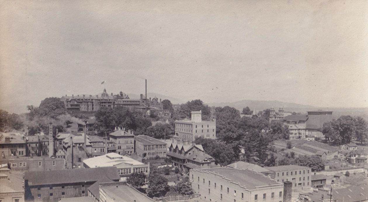 Black-and-white photograph of Asheville, North Carolina, taken from a high point of view. Several buildings are visible, as well as a large hotel at a higher point than the other buildings, visible on the left of the photograph.