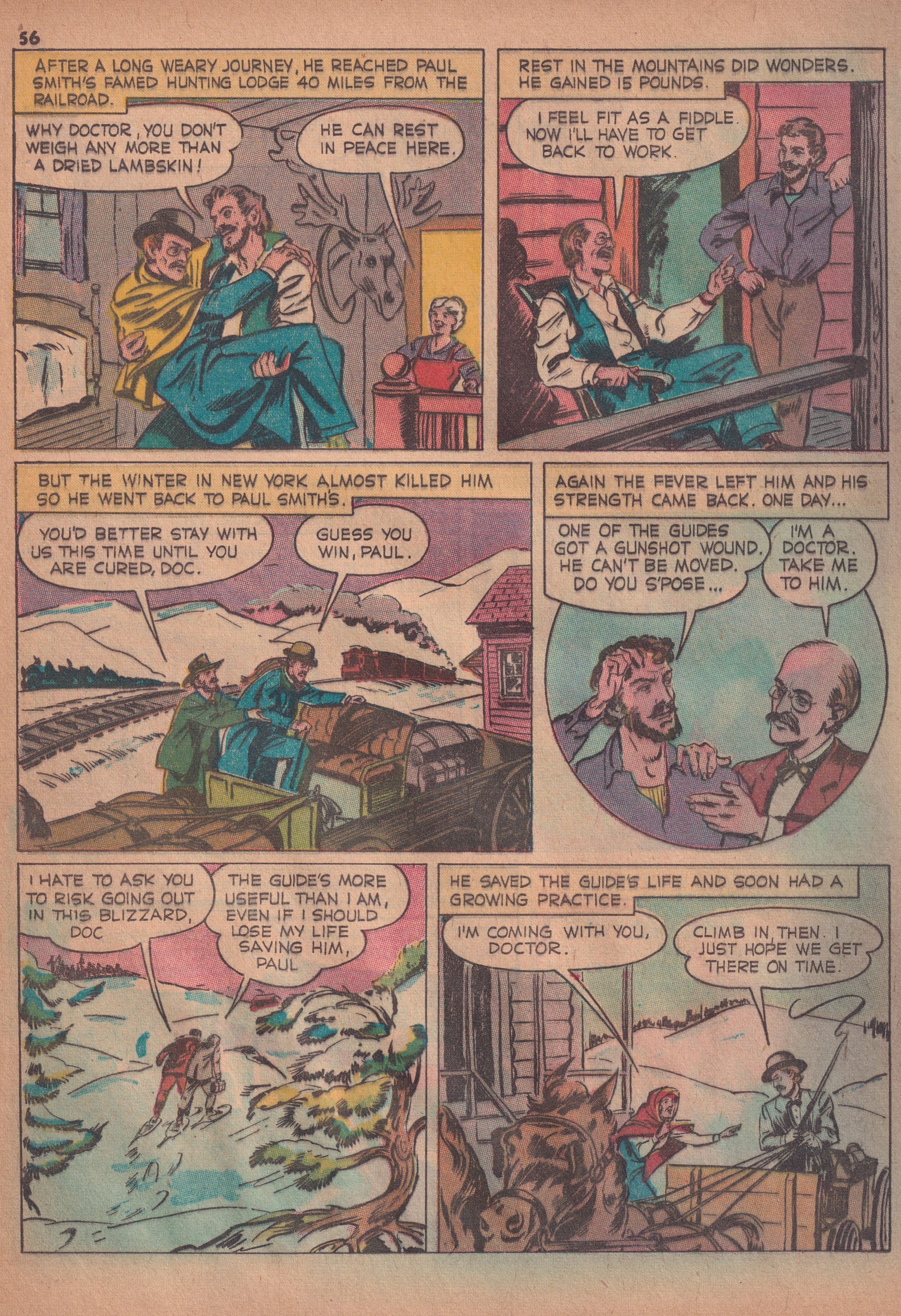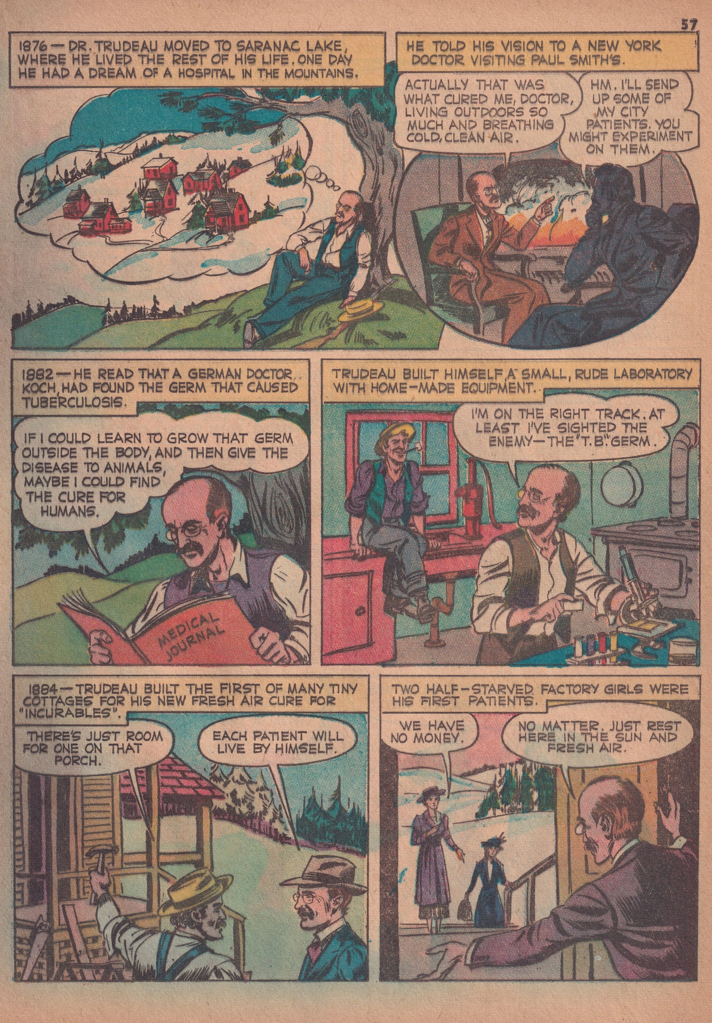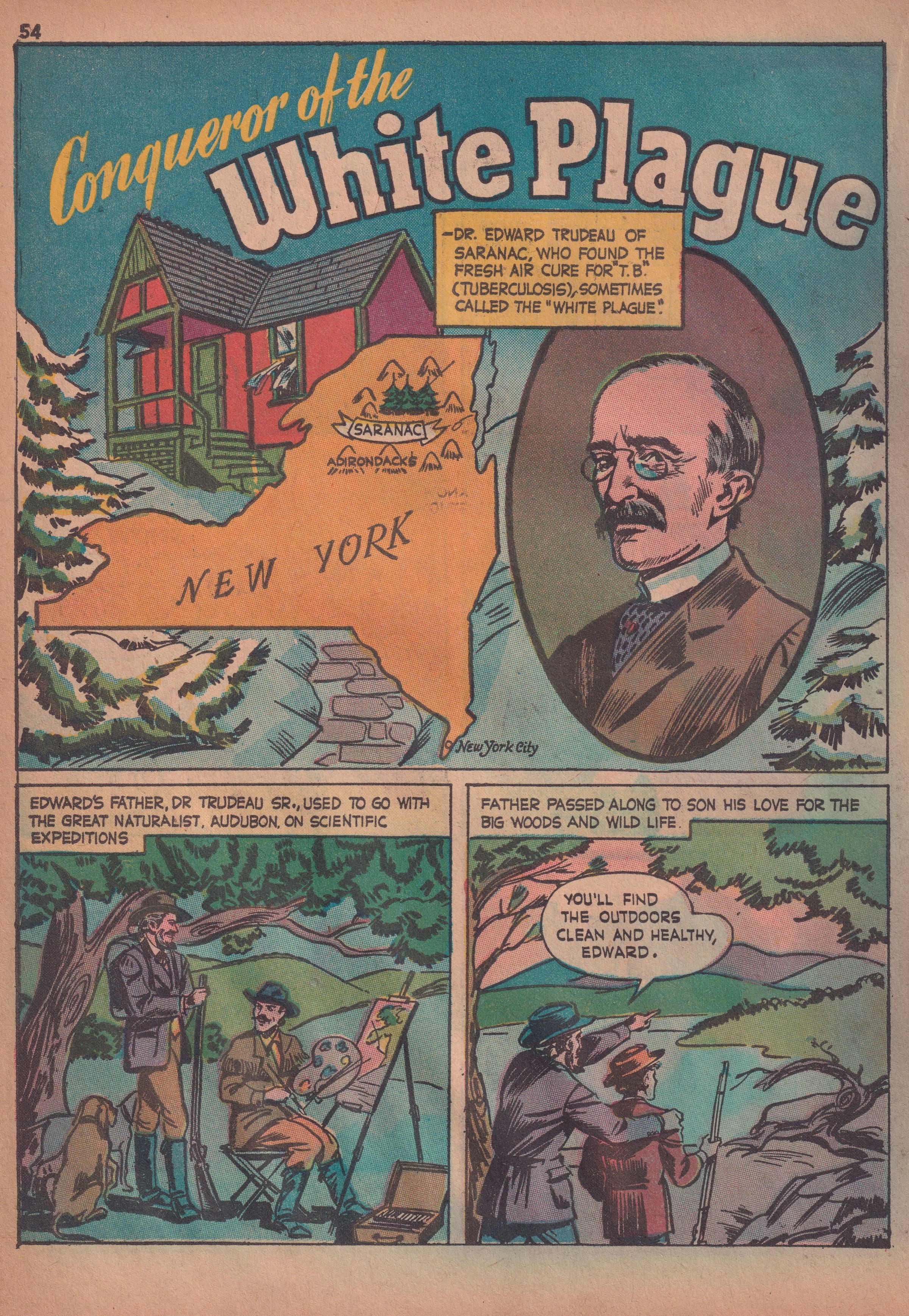 Comic strip “Conquerer of the White Plague,” removed from True Comics, Issue 19, December 1942. Details the story of Edward Livingston Trudeau’s arrival in Saranac Lake, creation of the Sanatorium, and the Rabbit Island experiments. 6p.Lexicon