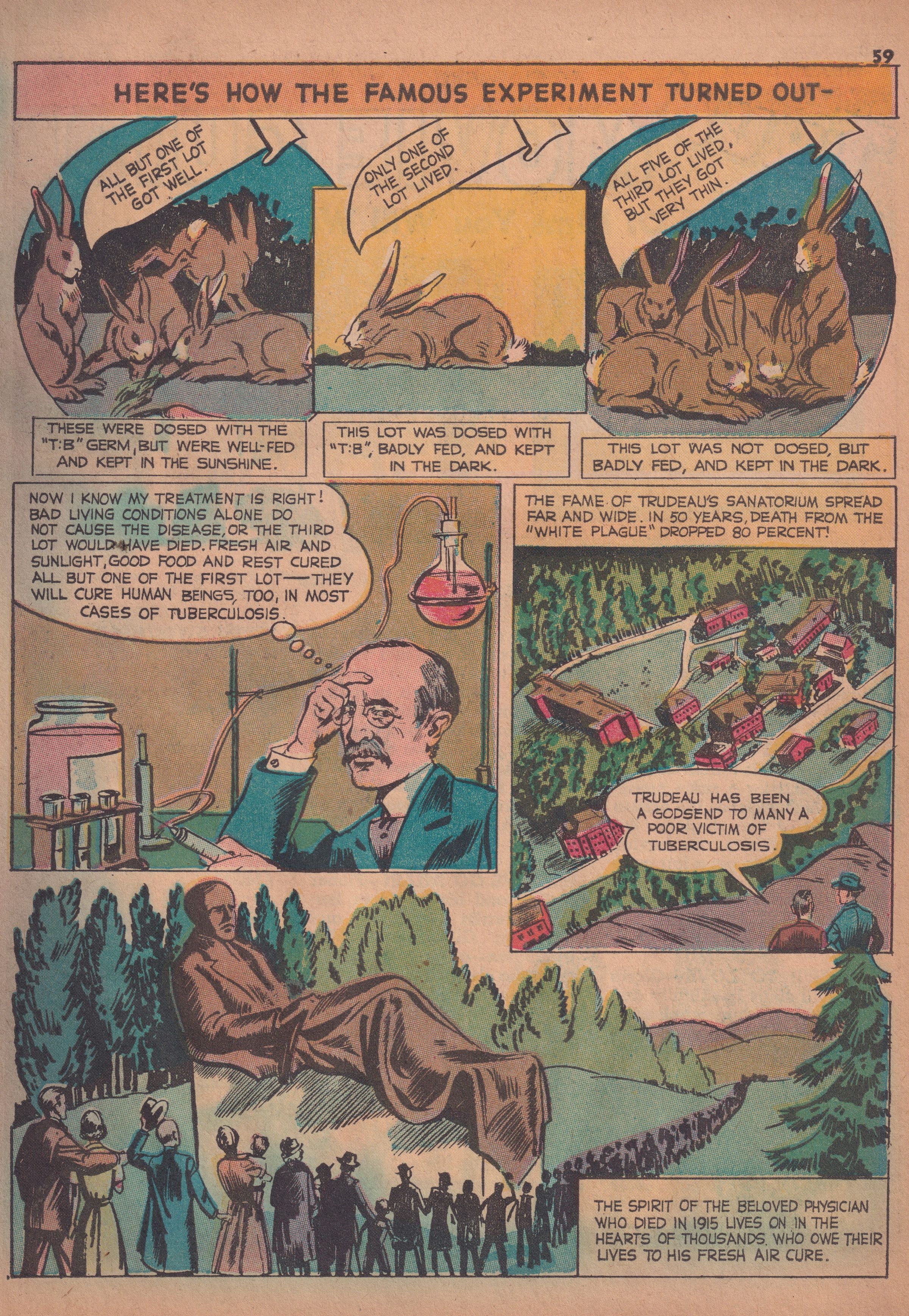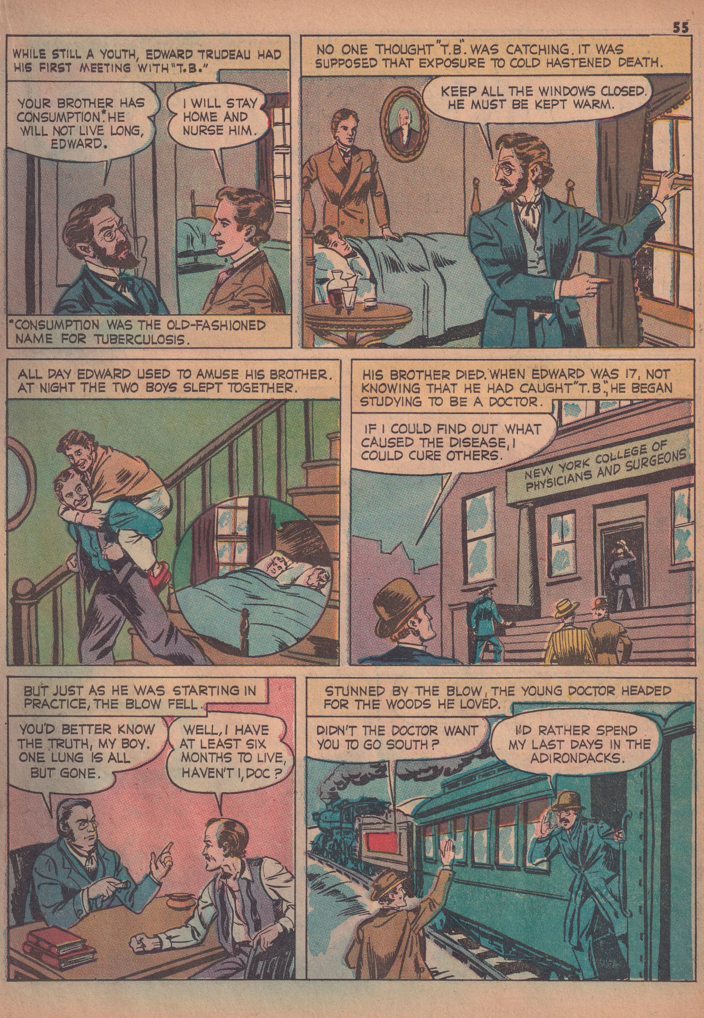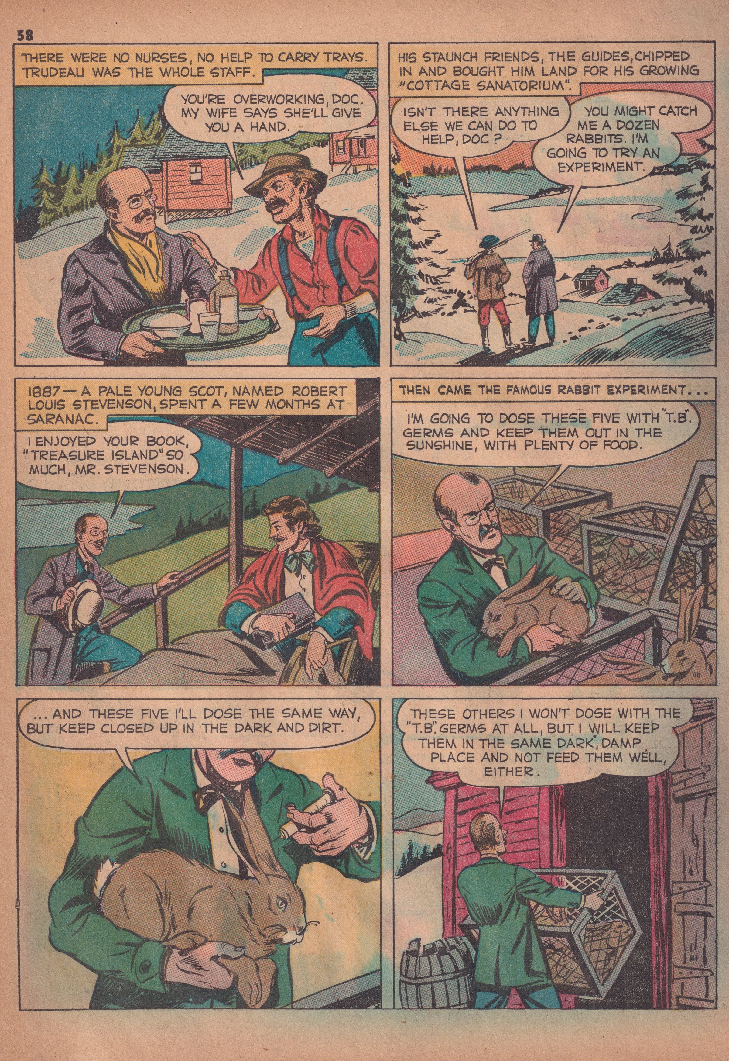 Comic strip “Conquerer of the White Plague,” removed from True Comics, Issue 19, December 1942. Details the story of Edward Livingston Trudeau’s arrival in Saranac Lake, creation of the Sanatorium, and the Rabbit Island experiments. 6p.Lexicon