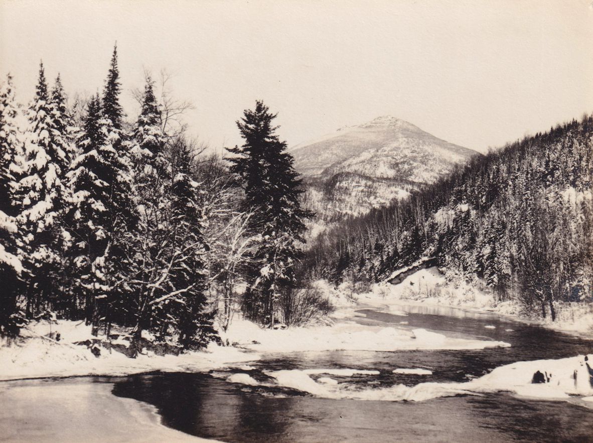 Black-and-White photograph of an unidentified river flowing through a snowy landscape. A mountain can be seen in the distance. The photograph was likely printed by Kollecker's Kodak and Gift Shop.