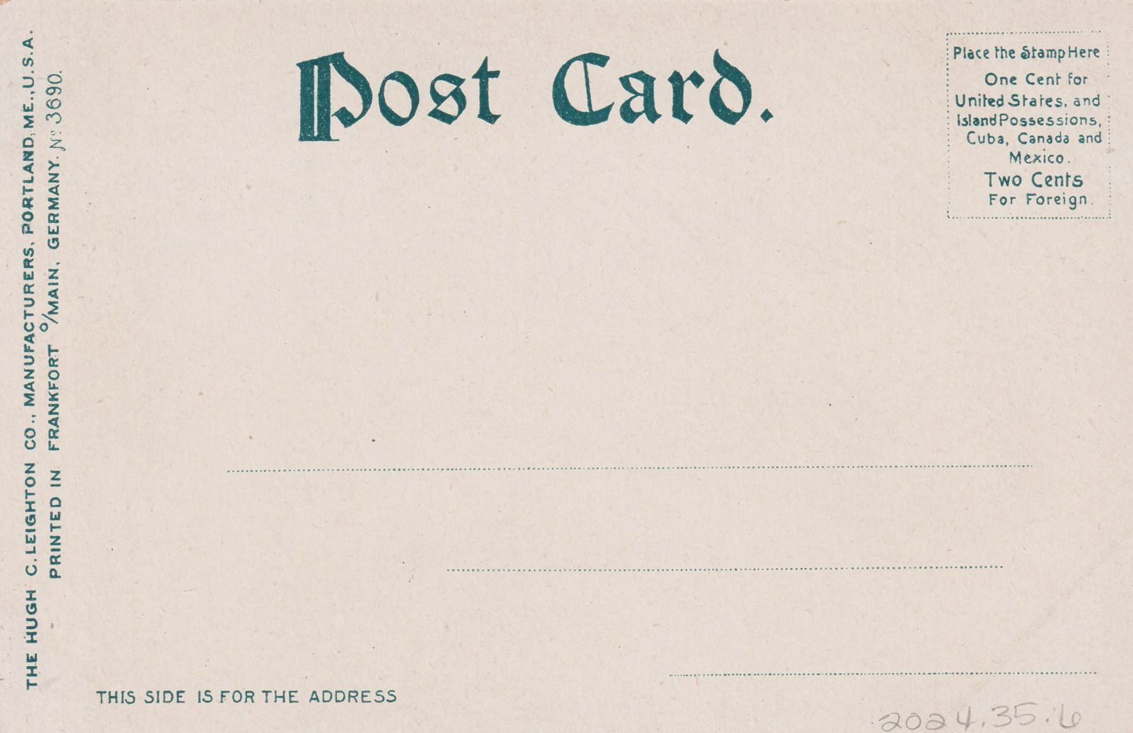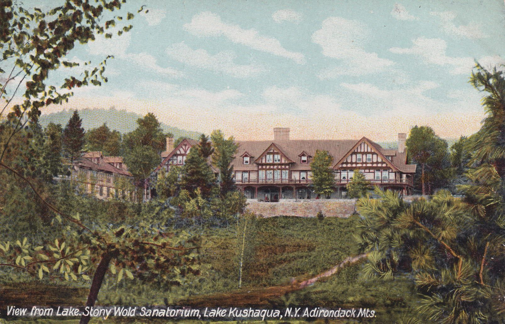 Color postcard of the view of Stony Wold Sanatorium from the shore of Lake Kushaqua. Printed caption on front reads, "View from Lake, Stony Wold Sanatorium, Lake Kushaqua, N.Y. Adirondack Mts." Printed by the Hugh C. Leighton Co., Portland, ME. Unused, undivided back.Subject Place