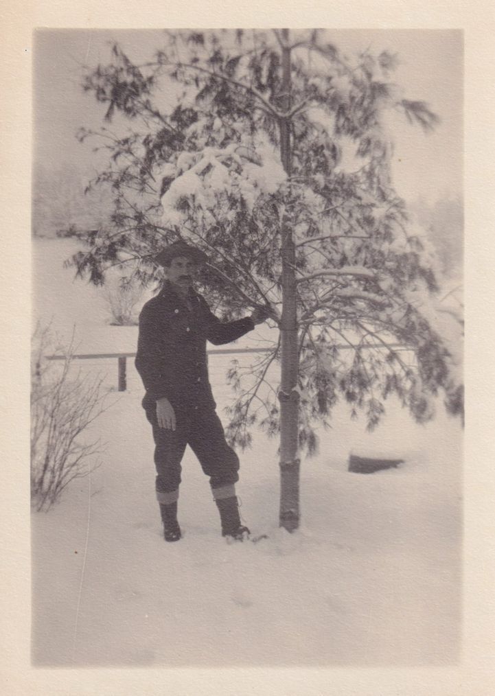 Black-and-White photograph of an unidentified man standing next to a tree in the snow. He has a large mustache. The photograph was likely printed by Kollecker's Kodak and Gift Shop.