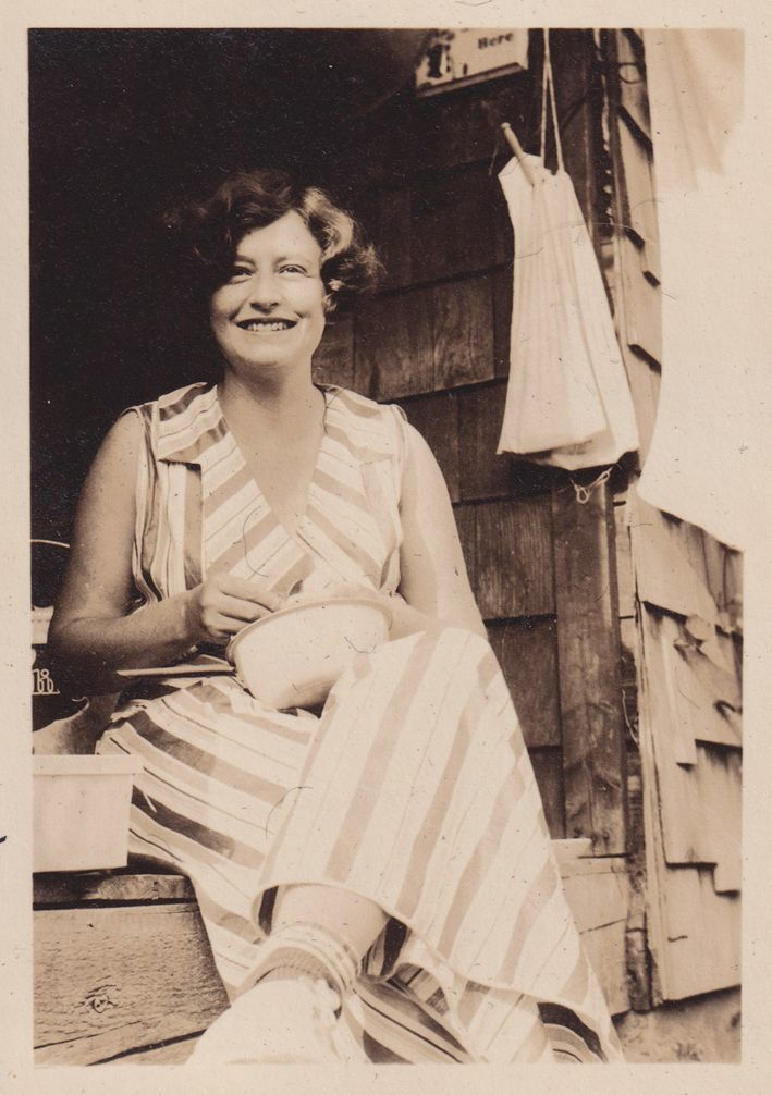Black-and-White photograph of Amy Jones, seated on the back step of their second house in Saranac Lake. Possibly 453 Lake Street. She is wearing a dress and sitting cross-legged with a bowl in her lap.