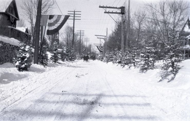 Negative of a snow covered road with horse drawn sleighs in the distance. Houses line either side of the road and there is bunting hanging from the electrical wire poles. Most likely taken by Mary Ives Baldwin. This item is not fully cataloged but has been uploaded so the image is publicly available; if you would like us to prioritize cataloging this item, please contact the HSL Collections team.