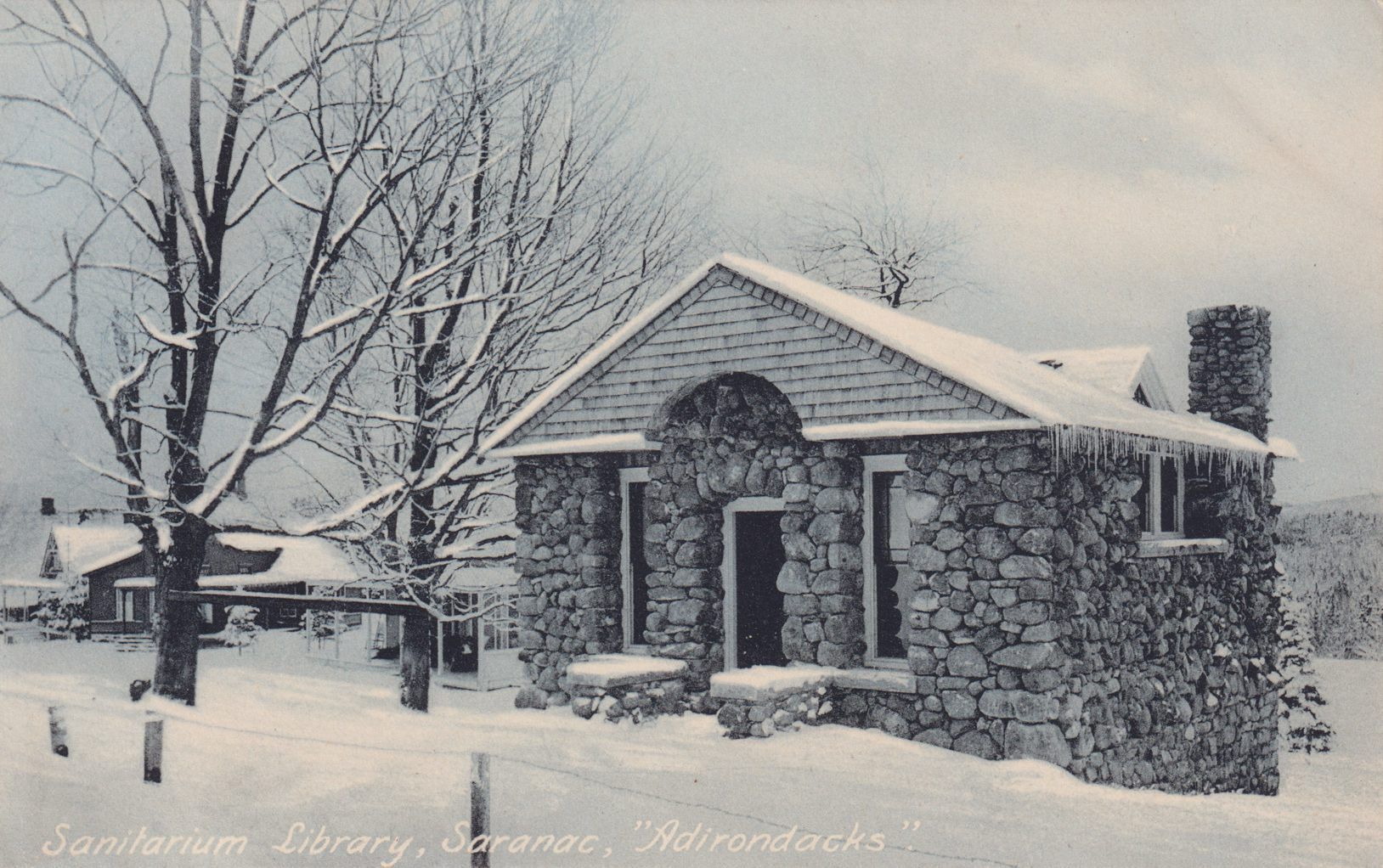 Grayscale postcard showing the original stone library at the Adirondack Cottage Sanitarium (later renamed Trudeau Sanatorium) in the snow. Printed caption on front reads, "Sanitarium Library, Saranac, 'Adirondacks'." Printed by the Rotograph Co., NYC. Used, divided back, postmarked Trudeau, NY, September 3, 1908. Handwritten message on back reads, "Trudeau, N.Y., Sept. 3. 08. Dear Clara, Found this postal yeserday. Send as you may not know it. We find G- slowly improving. She goes with us tomorrow to South Haven where we shall remain as long as the weather permits and she feels contented. Scenery most enjoyable air delightful here. Yours, Harriet F. Sill [?]." Mailed to Mrs. R. B. Farson [?], St. Charles, Illinois.Subject Place