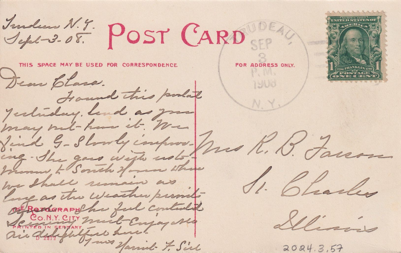 Trudeau, N.Y., Sept. 3. 08. Dear Clara, Found this postal yeserday. Send as you may not know it. We find G- slowly improving. She goes with us tomorrow to South Haven where we shall remain as long as the weather permits and she feels contented. Scenery most enjoyable air delightful here. Yours, Harriet F. Sill [?].Transcriber