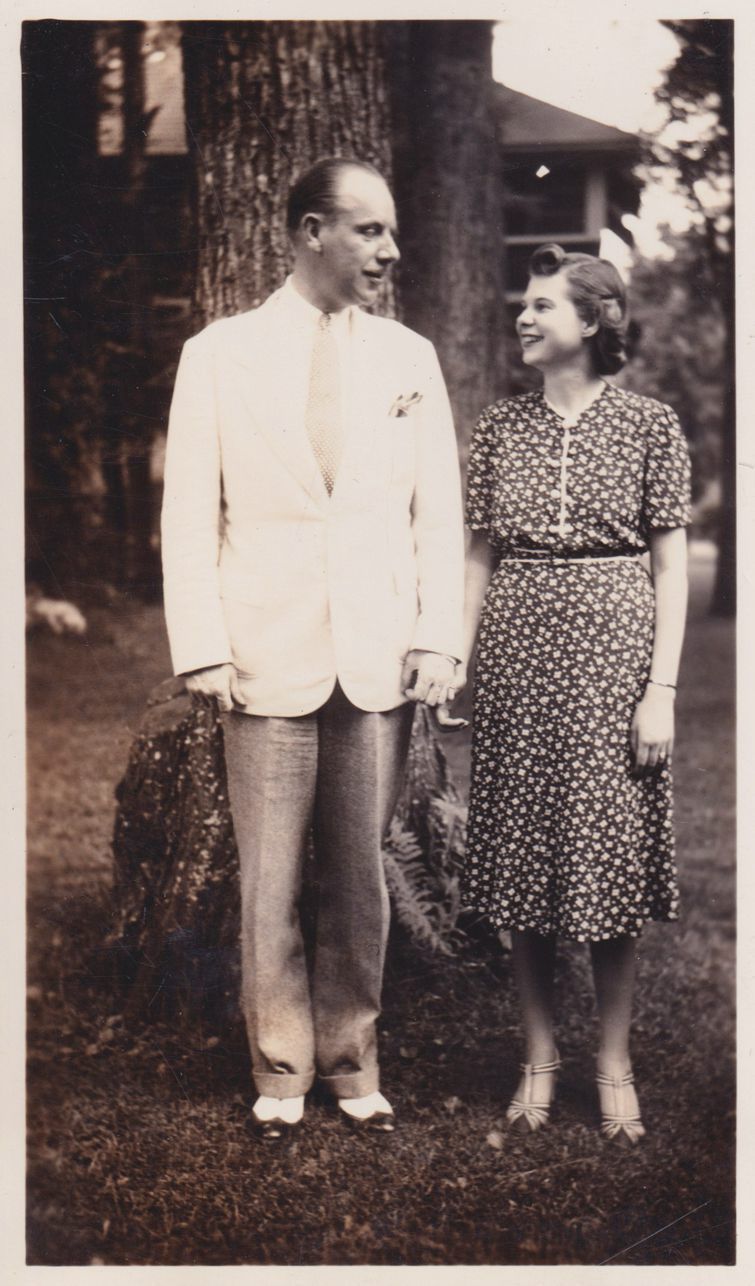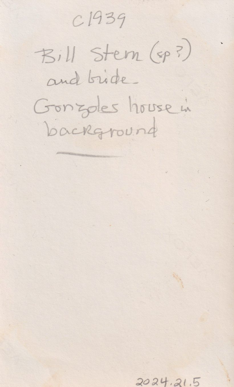Black-and-White photograph of a man and a woman standing outside looking at each other. Handwritten note on back reads, "c. 1939. Bill Stern (sp?) and bride. Gonzalez house in background."