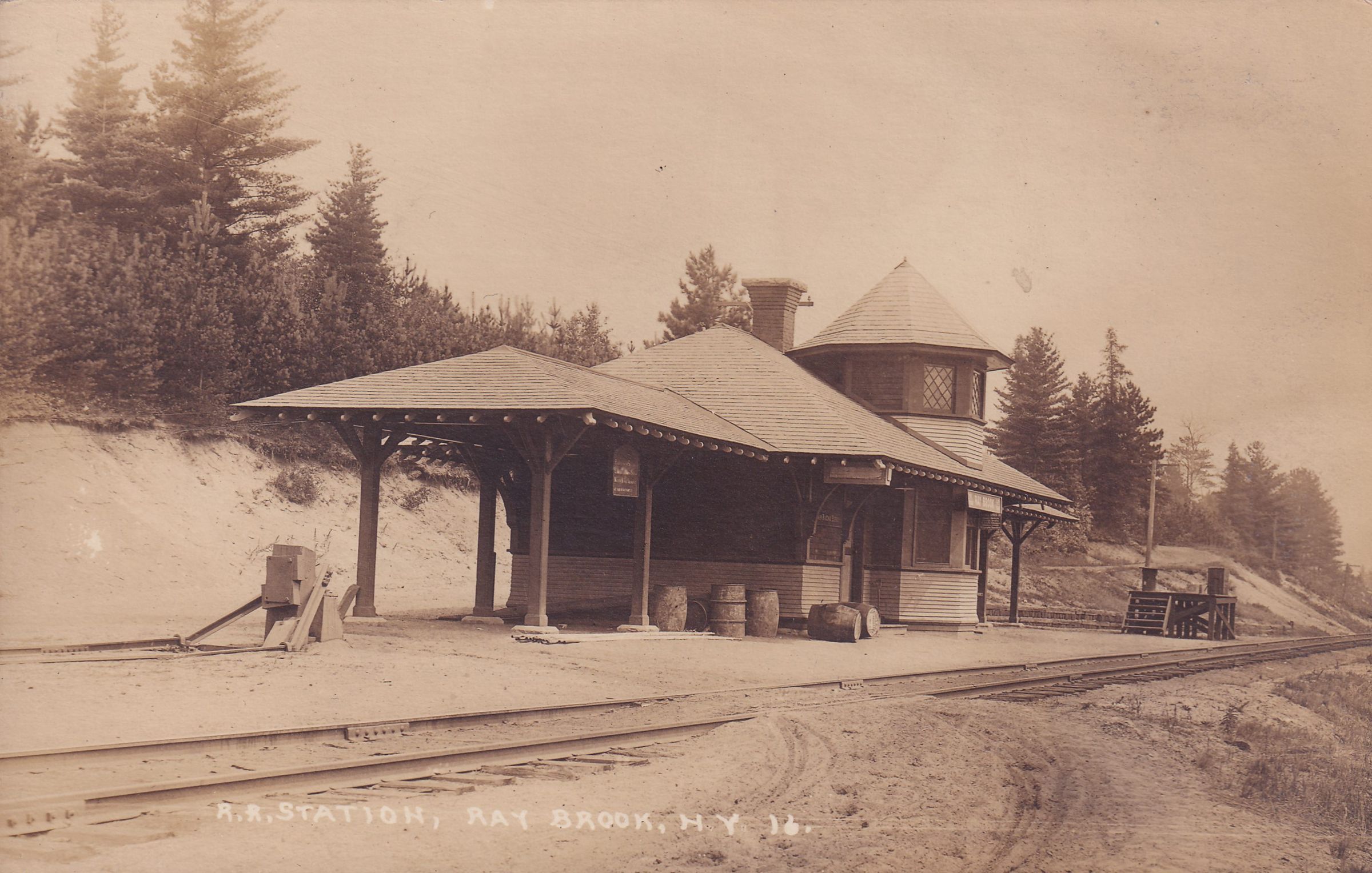 Black-and-white photograph postcard of the railroad station at Ray Brook, NY. Printed caption on the front reads, "R. R. Station, Ray Brook, N.Y. 16." Unused, undivided back. No printer or photographer’s mark.Subject Place