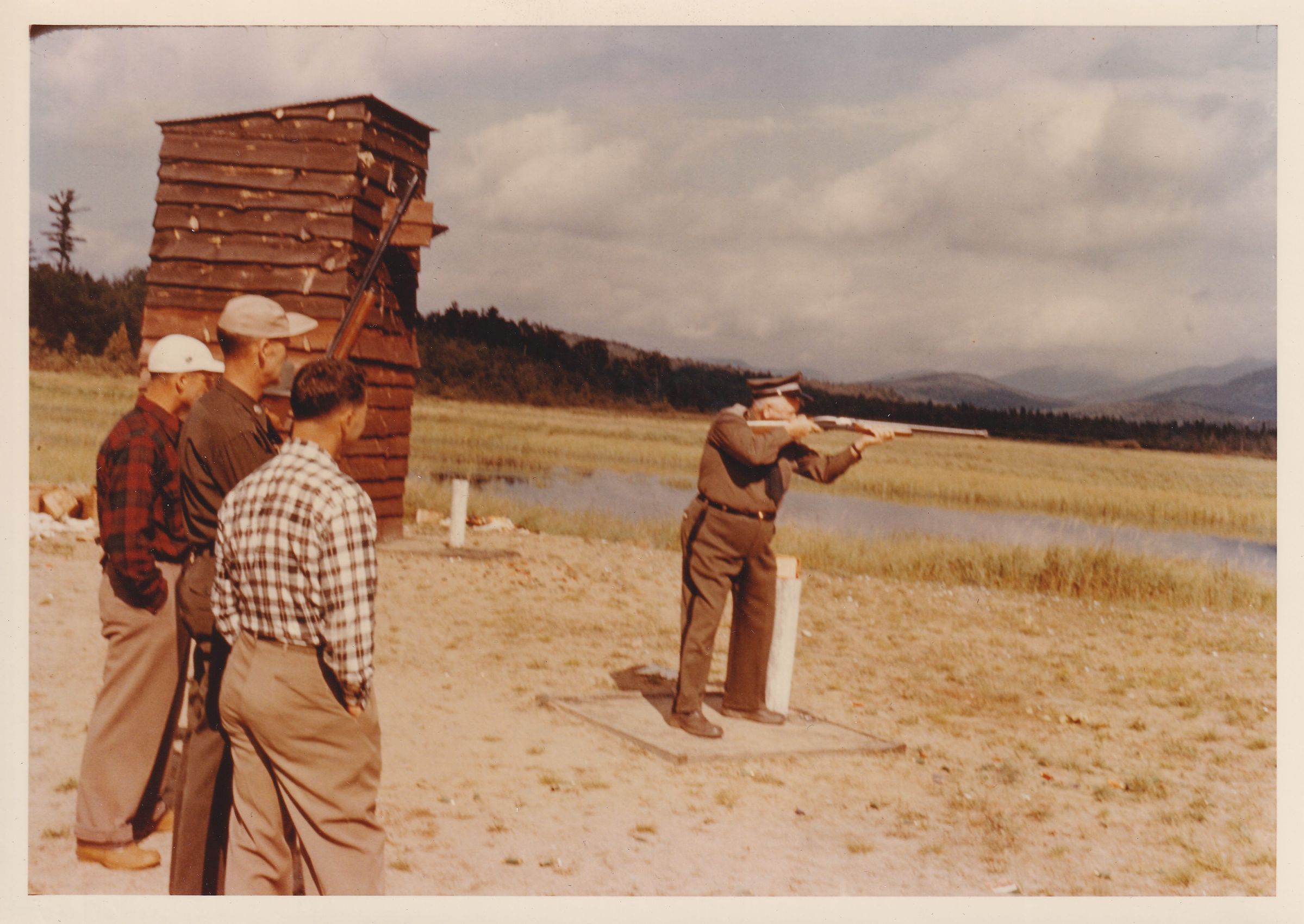 Color photograph of Ray Burmaster in uniform, shooting at a rifle range. Three men are looking on.