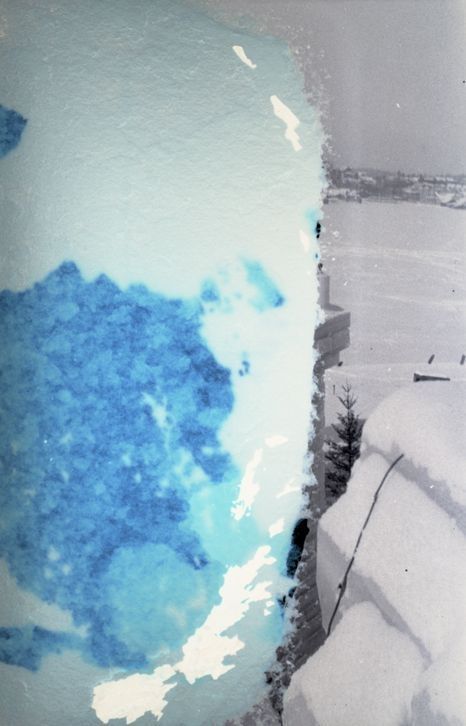 Negative of the view over a lake, taken from one shore. There is the edge of a roof in the bottom corner of the image, but most of the negative is covered by a piece of paper that is stuck to its surface. Most likely taken by Mary Ives Baldwin. This item is not fully cataloged but has been uploaded so the image is publicly available; if you would like us to prioritize cataloging this item, please contact the HSL Collections team.