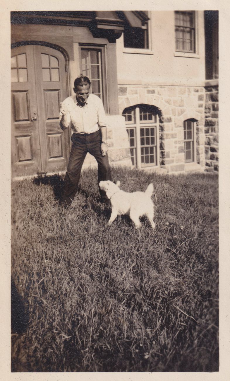 Black-and-White photograph of an unidentified man, likely a patient, standing outside of the National Vaudeville Artists' Home. He is playing with the Jones Family's dog, Peggy.