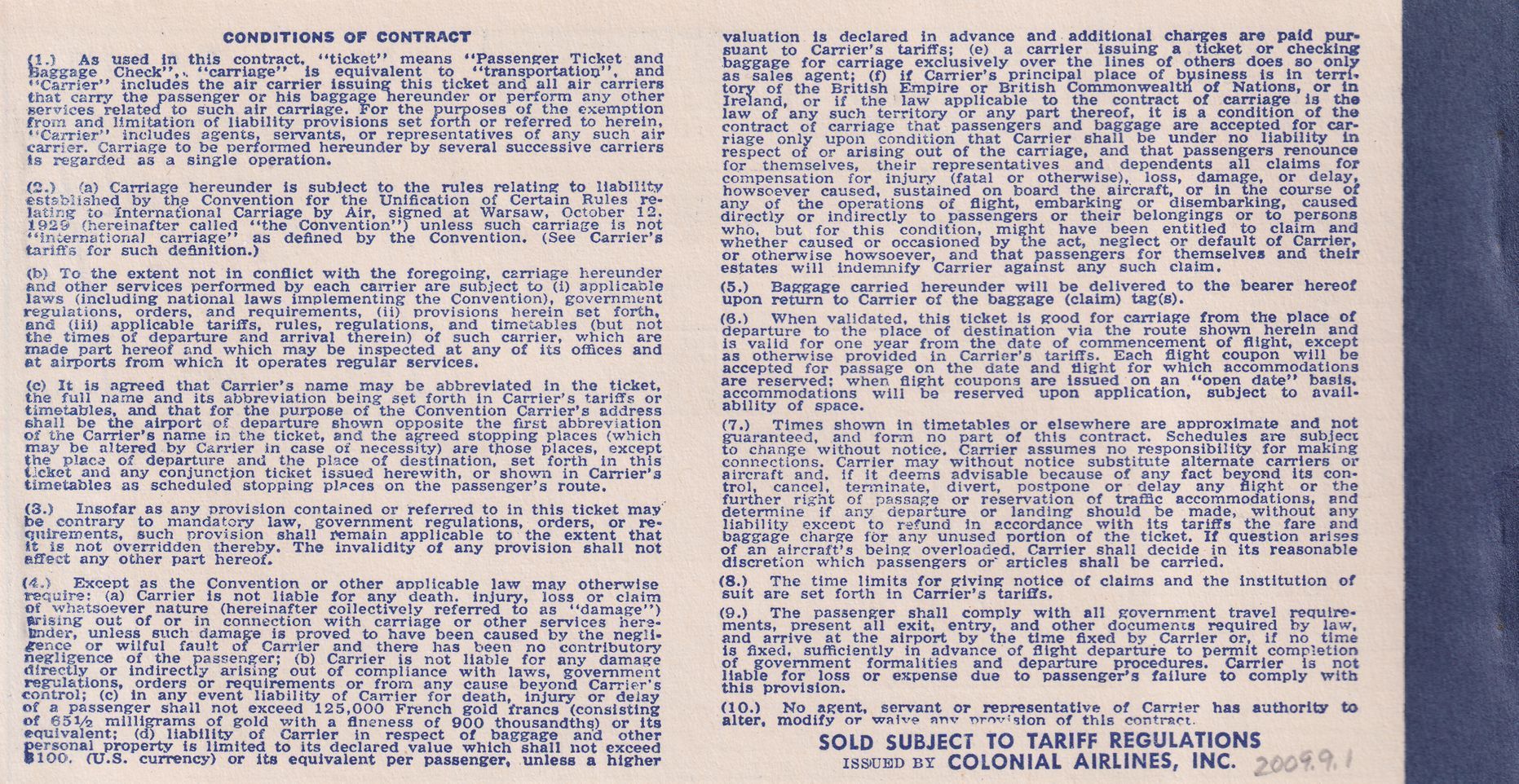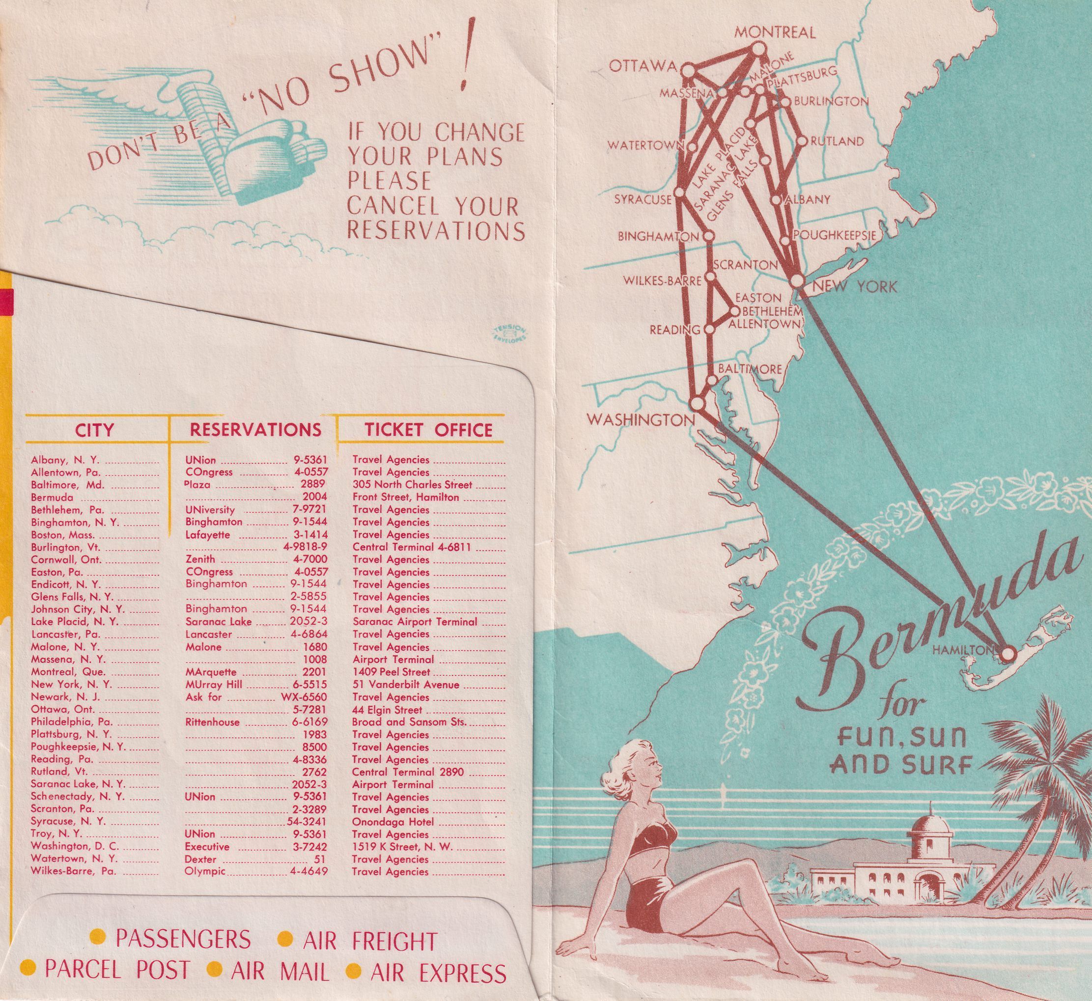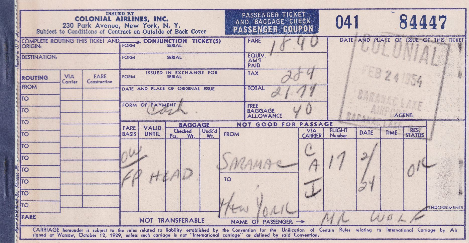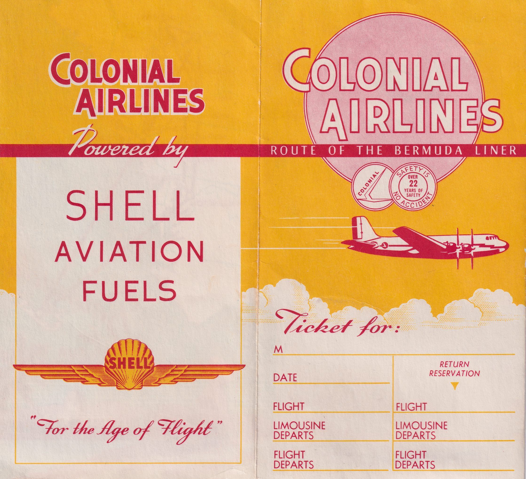 Tickets and boarding passes for passage from Saranac Lake (SLK) to New York on Colonial Airlines, 1954. In paper sleeve advertising route to Bermuda on Colonial Airlines.