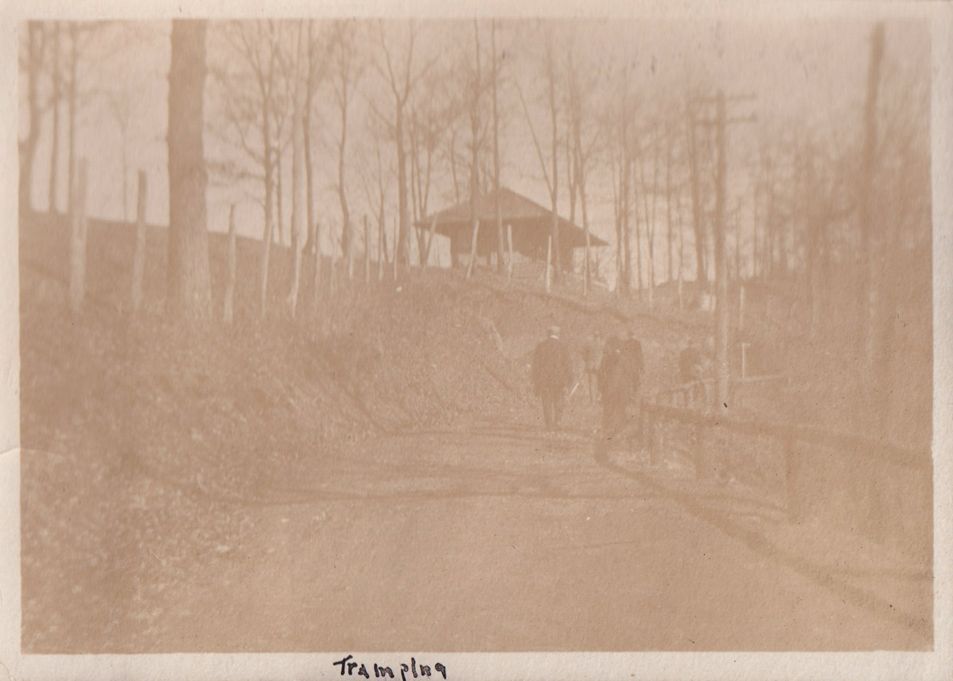 Black-and-white photograph of a group of four men walking along a dirt path through a wooded area. There is a building with a large roof in the distance along the path. "Tramping" is written in ink beneath the photograph.