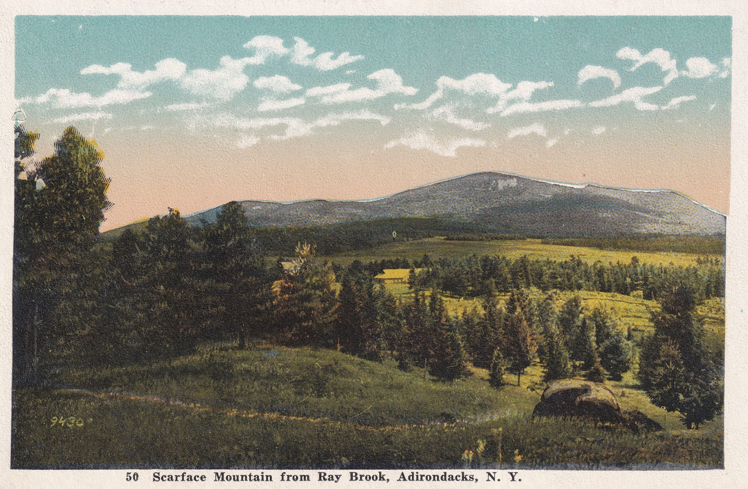 Color postcard showing the view across rolling hills to Scarface Mountain. Printed caption on the front reads, "Scarface Mountain from Ray Brook, Adirondacks, N.Y." Unused, divided back, white border. No printer's mark.Subject Place