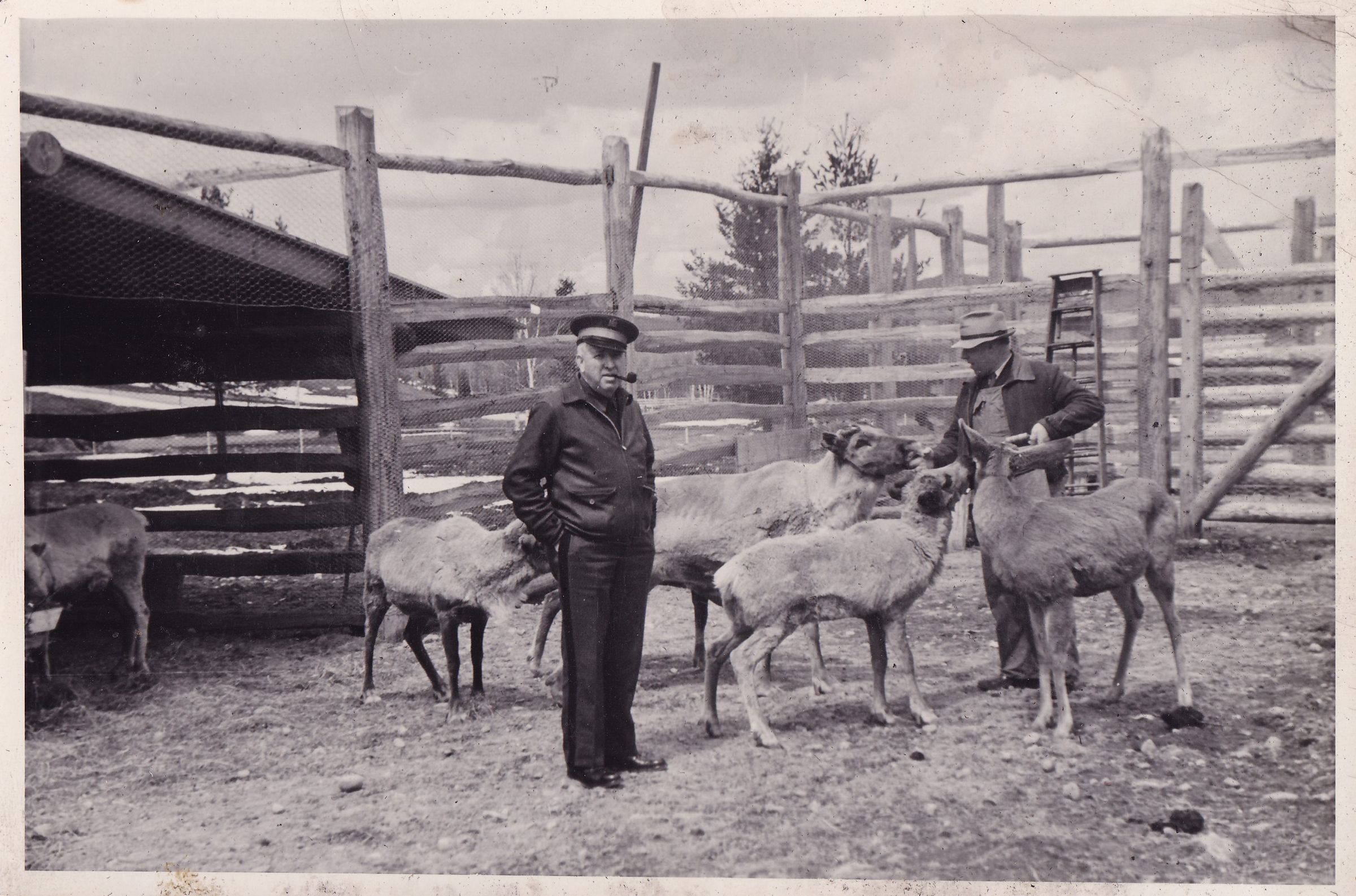 Black-and-White photograph of two men feeding reindeer in a pen with a wooden fence.
