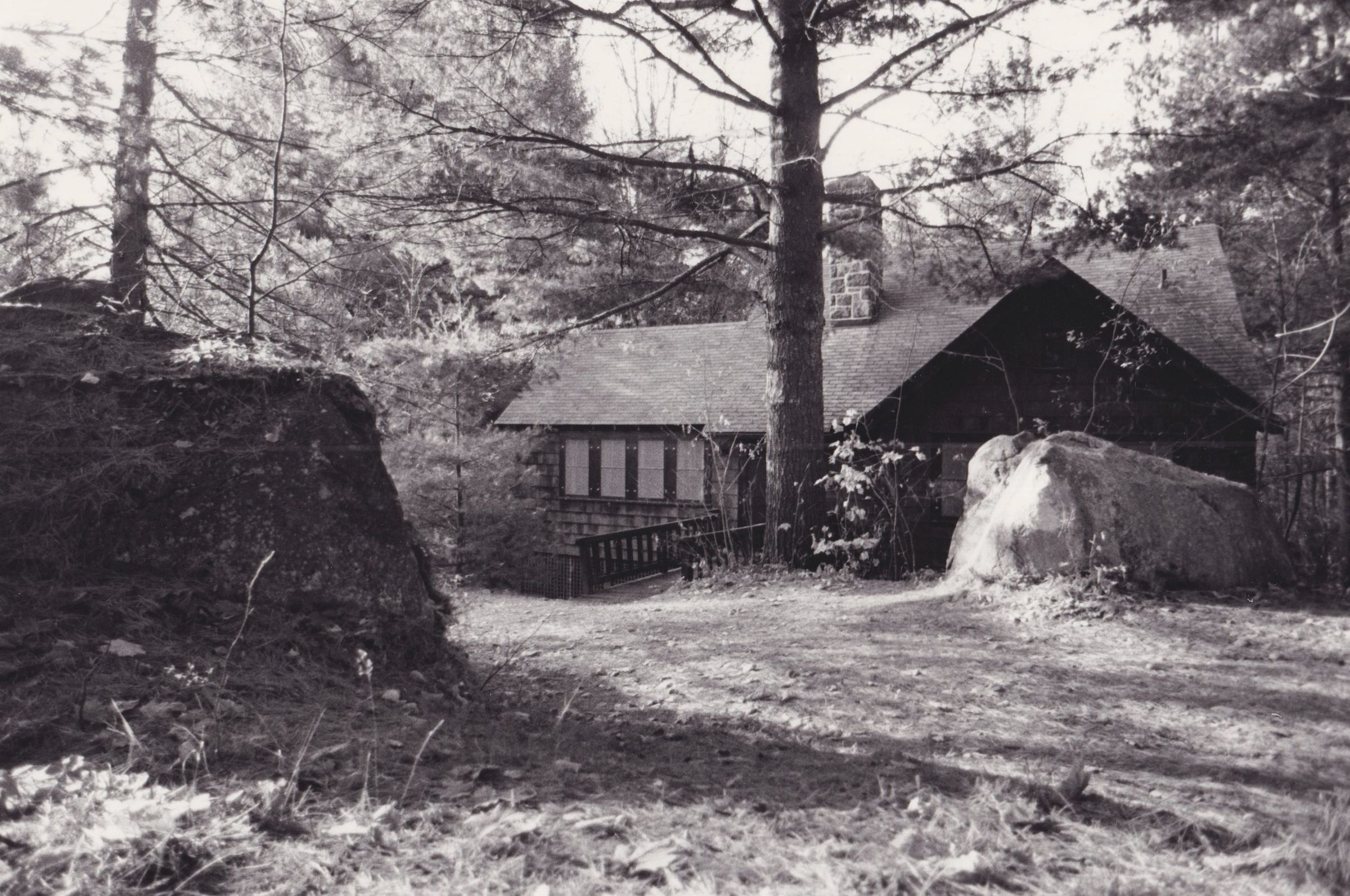 Black-and-White photograph of a small unidentified cottage at Bartlett Carry Club. Two large boulders can be seen in front of the building.