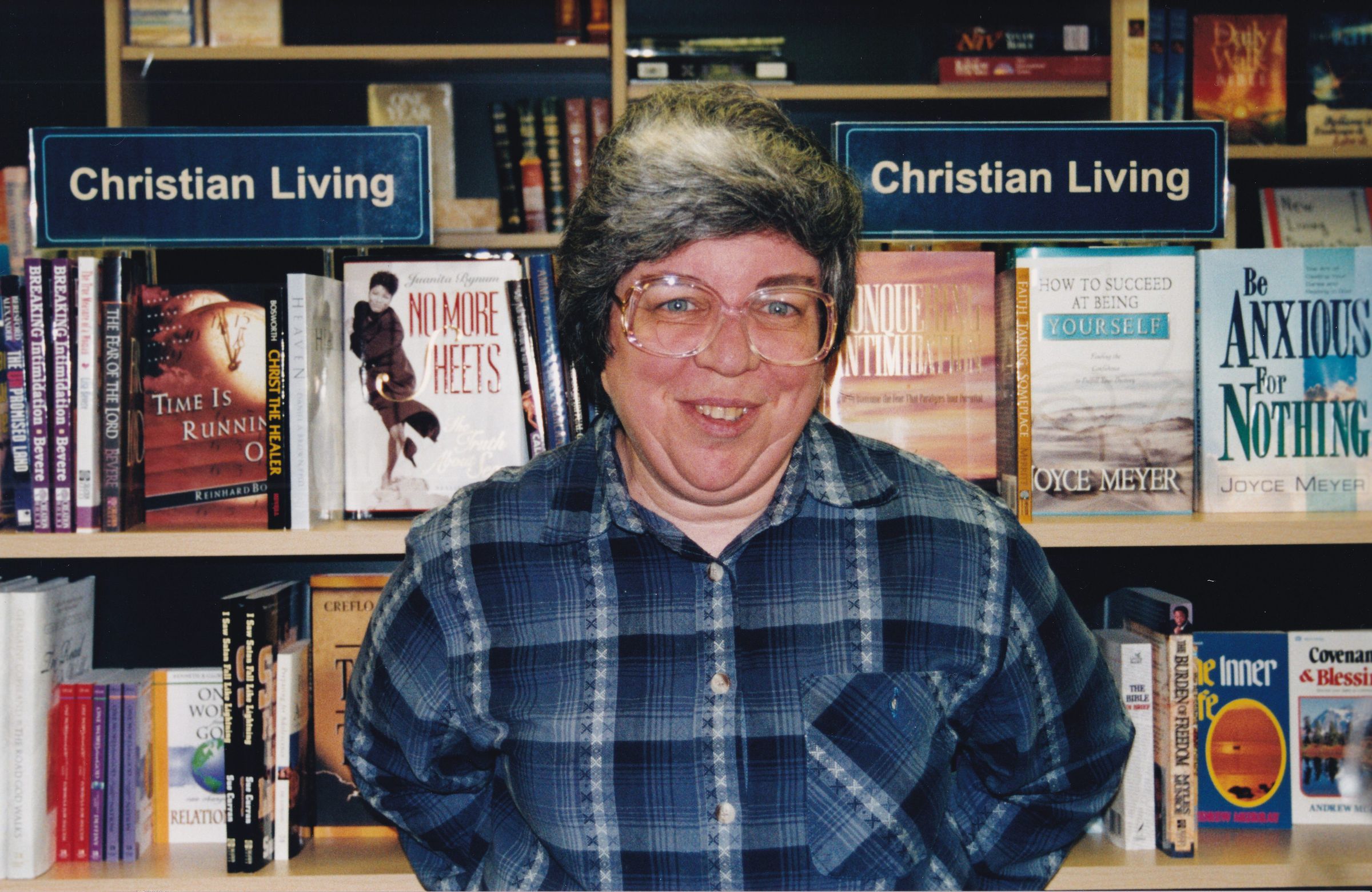 Color photograph of Wendy Foley before a wall of books inside of her business, Wendy's Place. Portrait taken by Mary Lou Hanpeter Banks as part of her Soul Proprietor exhibition.