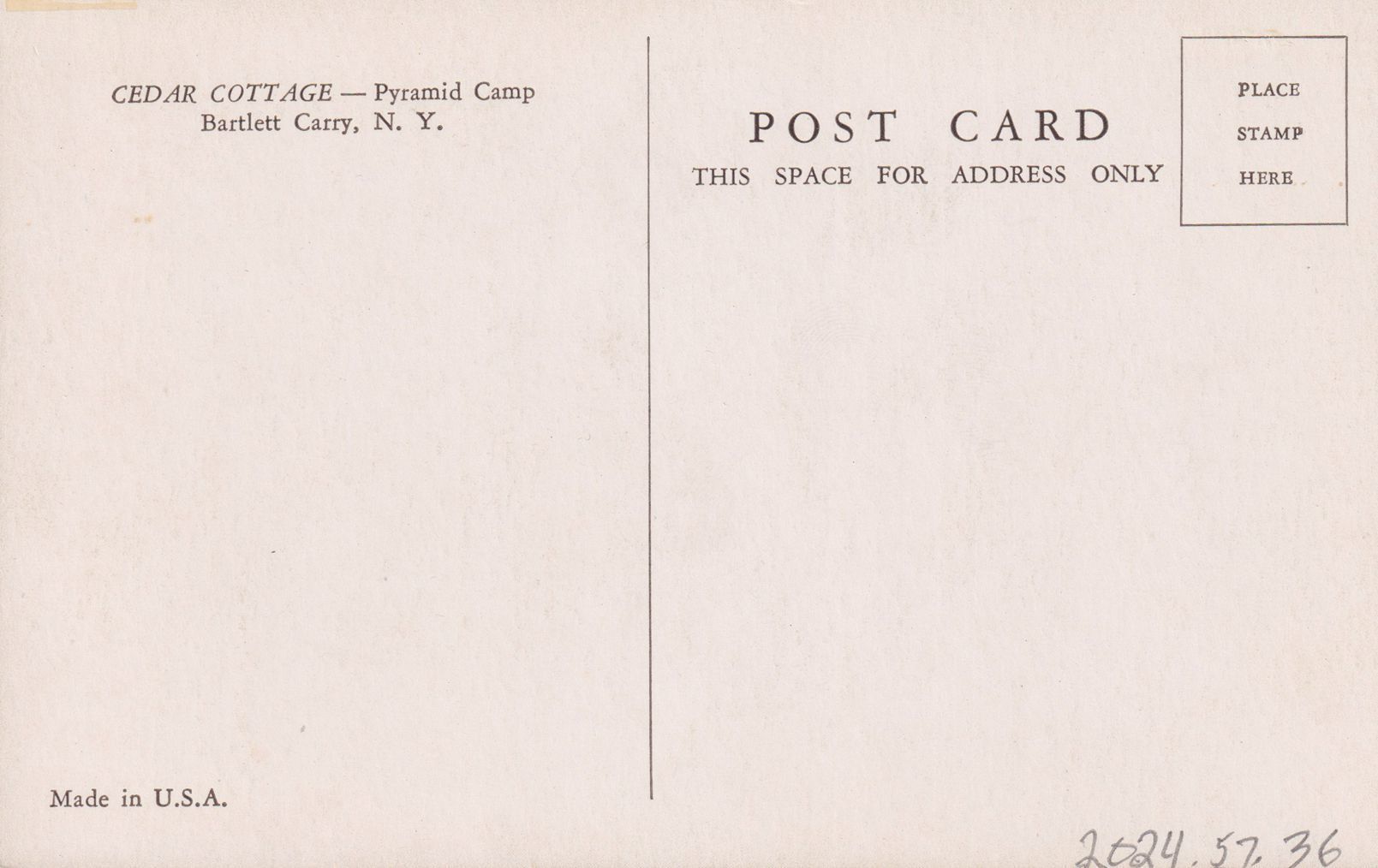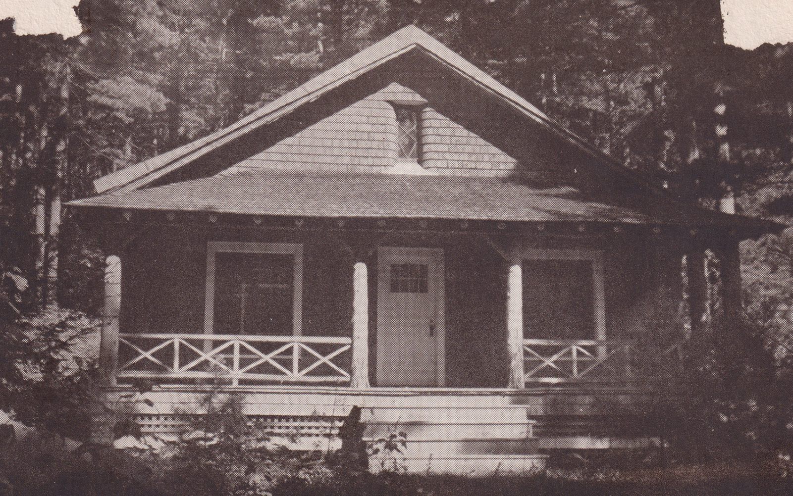 Black-and-White postcard showing the Cedar Cottage at Pyramid Camp (AKA Bartlett Carry Camp). No printer's mark. Unused, divided back.