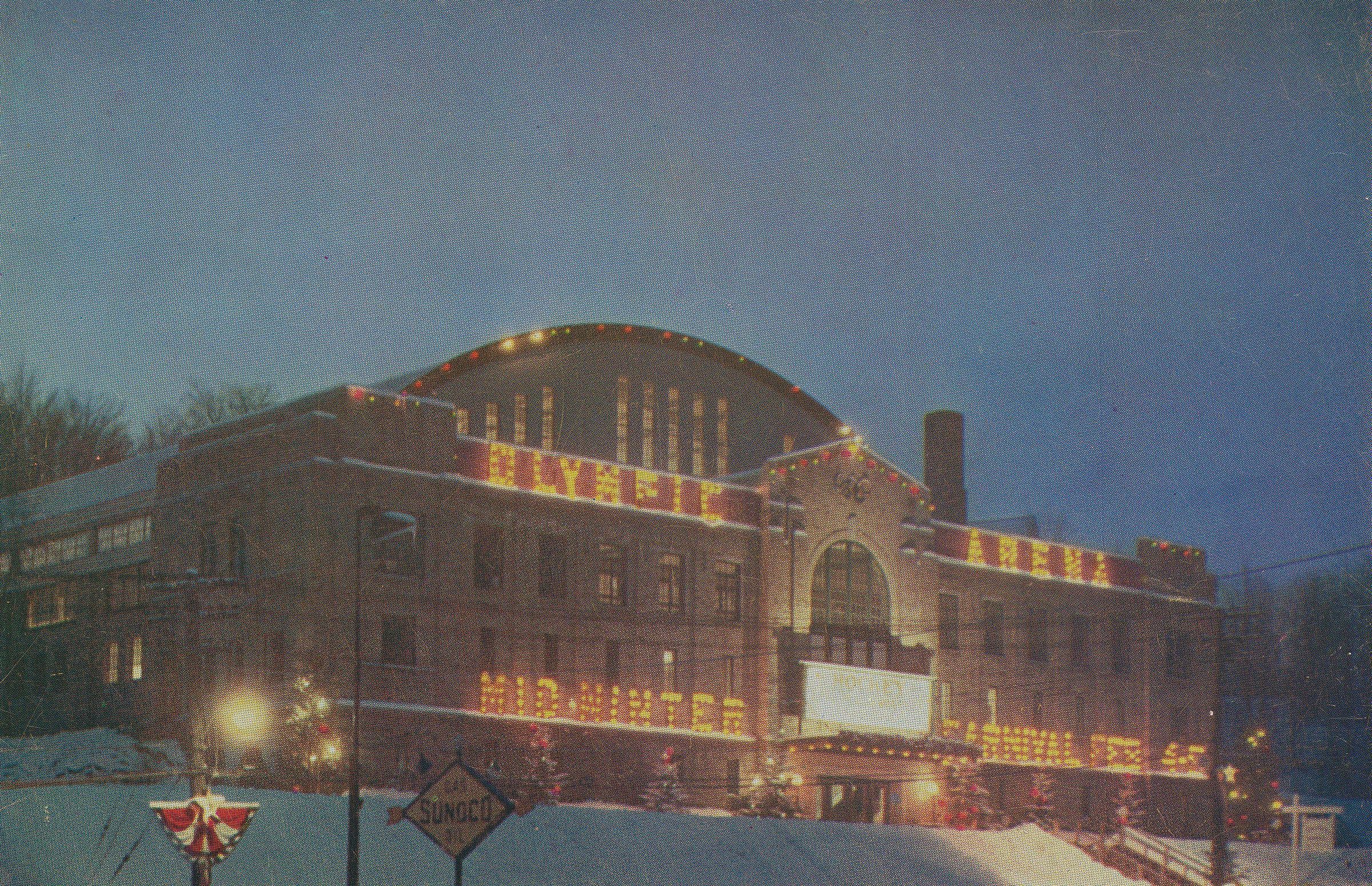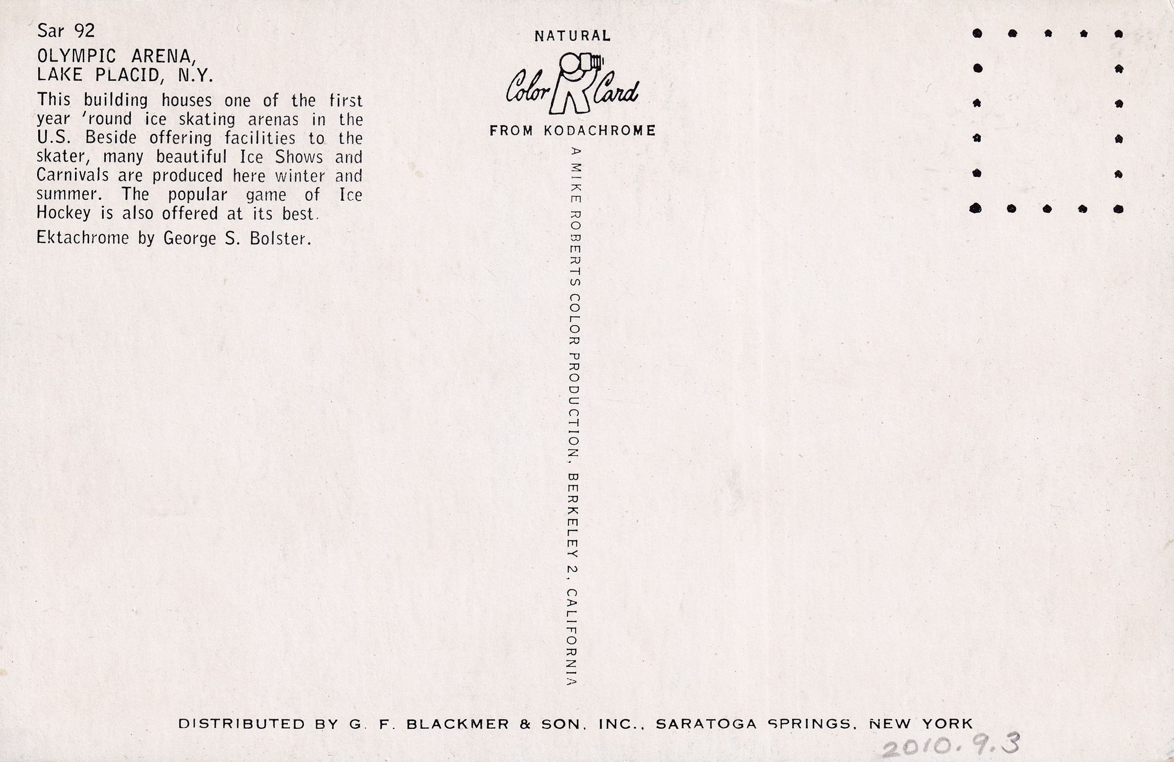 Color postcard of the Olympic Arena in Lake Placid, New York. Caption on reverse reads, "This building houses one of the first year 'round ice skating arenas in the U.S. Besides offering facilities to the skater, many beautiful Ice Shows and Carnivals are produced here in the winter and summer. The popular game of Ice Hockey is also offered at its best." Unused, divided back. Printed by Mike Roberts Color Production / G. F. Blackmer & Son, Inc., Saratoga Springs, New York. Ektachrome photo by George S. Bolster.Made/Created