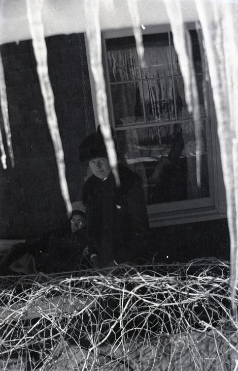 Negative of two unidentified people on a porch in winter. One is laying down against the other. There are icicles hanging off the roof of the porch. Most likely taken by Mary Ives Baldwin. This item is not fully cataloged but has been uploaded so the image is publicly available; if you would like us to prioritize cataloging this item, please contact the HSL Collections team.