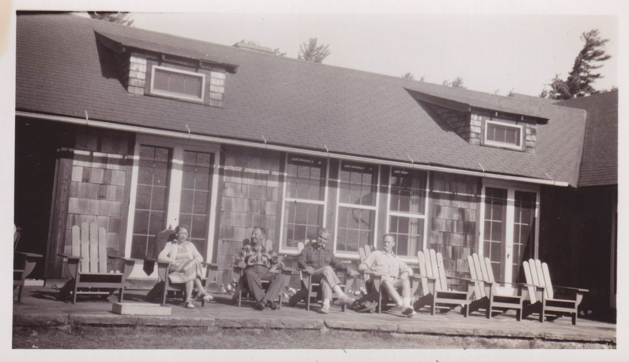 Black-and-White photograph of a group of people seated in Adirondack chairs in front of an unidentified building at the Bartlett Carry Club.