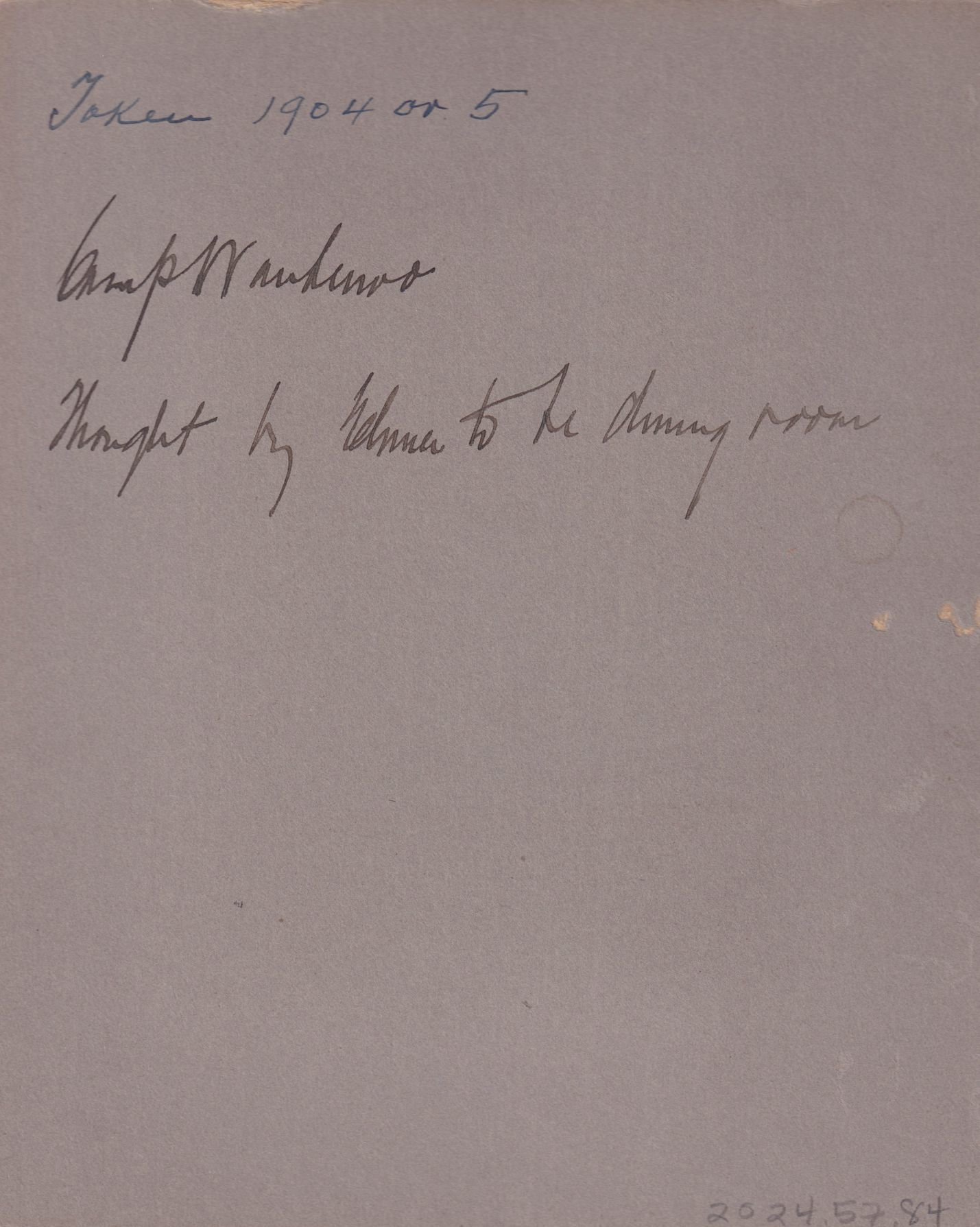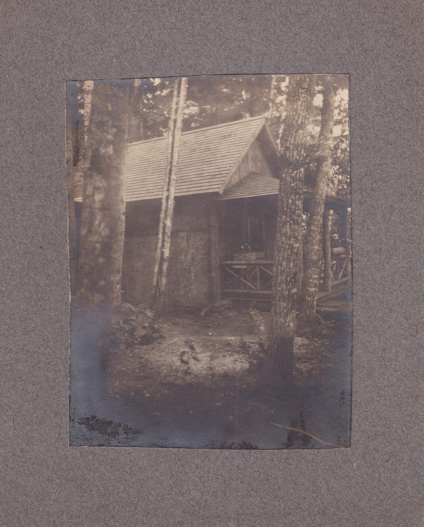 Black-and-White photograph of a cottage seen through the woods. Handwritten note on reverse reads, "taken 1904 or 1905." Note in different handwriting reads, "Camp Waubenoo. Thought by [?] to be the dining room." Mounted on gray cardboard backing.