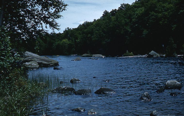 Color Kodachrome slide showing rocks in a river. Handwritten note on front reads, "Rocks Below Bartlett's Carry." From a group of vacation slides taken by an unidentified family.