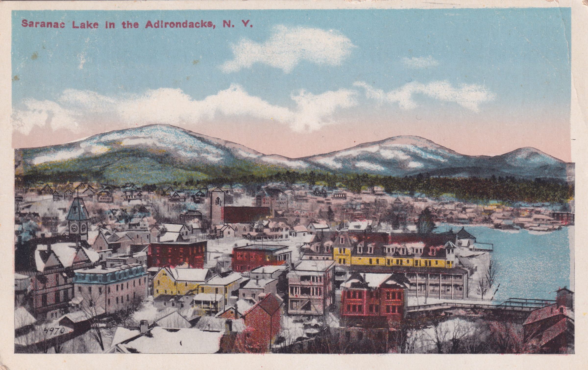 Color postcard showing a birds-eye view of Saranac Lake looking west from Lake Street hill over downtown Saranac Lake and Lake Flower. The old Harrietstown Town Hall, Riverside Inn, and other buildings are visible with mountains in the background. Used, divided back, postmarked August 2, 1916, Trudeau, NY. Published by Rudolph Bros. Art Publishers, Syracuse, New York. Caption printed on front reads, "Saranac Lake in the Adirondacks, N. Y." Handwritten message on the back reads, "Saranac Lake, Aug 1, 1916. Dear Bill: We are here for the night and after calling on Everett Crothers in the morning will push on to Plattsburg. Hope to arrive at Plattsburg tomorrow night. Only made 86 miles today. Couldn't make time on account of the hills and winding roads. Saw a fawn today. If I only had a little salt and could get near enough to him think I could have caught him. This place is livelier than Geneva but would rather live in Phelps. Rather chilly this evening. Have had fine weather thus far. Tell Gram not to worry about us. We are collecting souvenirs for you. Dad"Subject Place