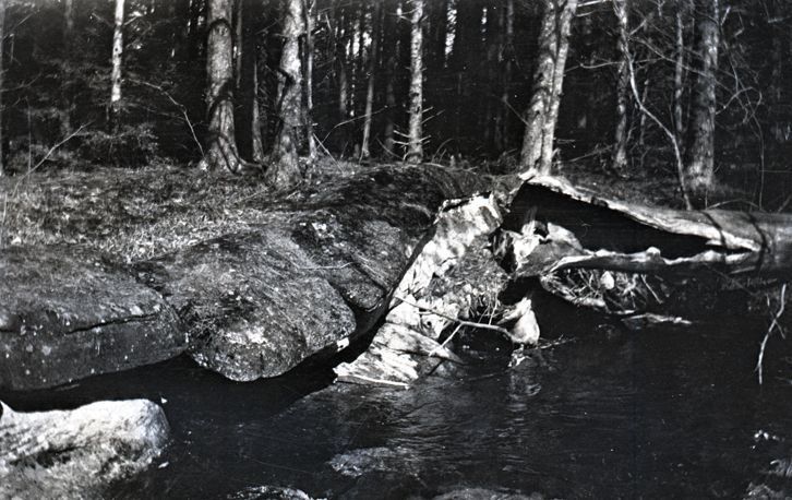 Negative an overgrown river edge in a forest. Most likely taken by Mary Ives Baldwin. This item is not fully cataloged but has been uploaded so the image is publicly available; if you would like us to prioritize cataloging this item, please contact the HSL Collections team.