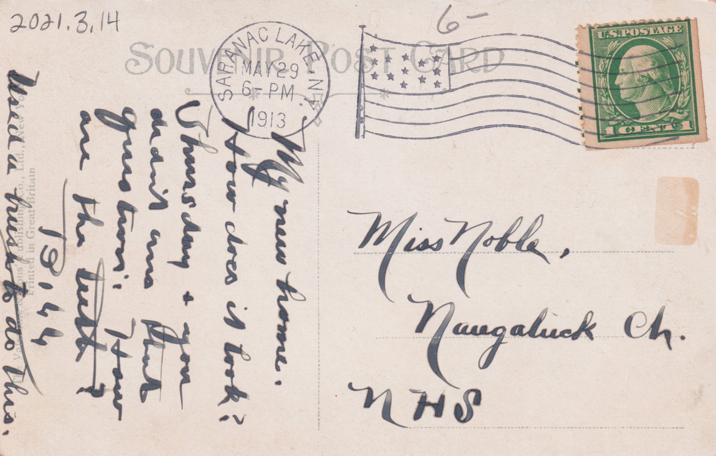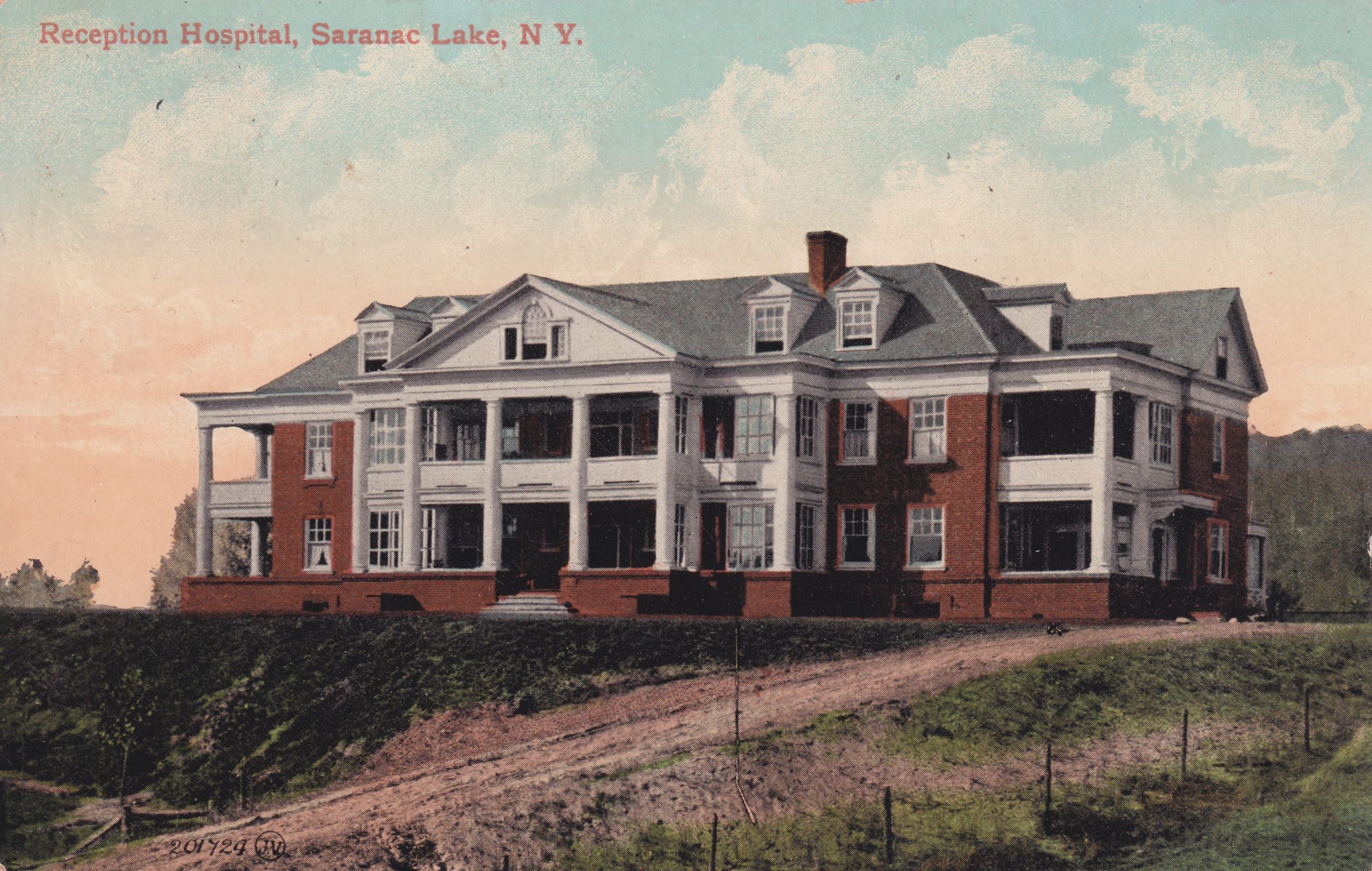 Color postcard of Reception Hospital/Prescott House from the front, surrounded by open grounds. Used, divided back, postmarked May 29, 1913 from Saranac Lake, NY. Published by Valentine & Sons' Publishing Co. Ltd. New York. Caption printed on front reads, "Reception Hospital, Saranac Lake, N.Y." Handwritten message on the back reads, "My new home. How does it look? Thursday and you didn't ans [sic] that question. How are the teeth? Bill - Used a brush to do this." Sent to Miss Noble, Naugatuck CH, NHS.Subject Place