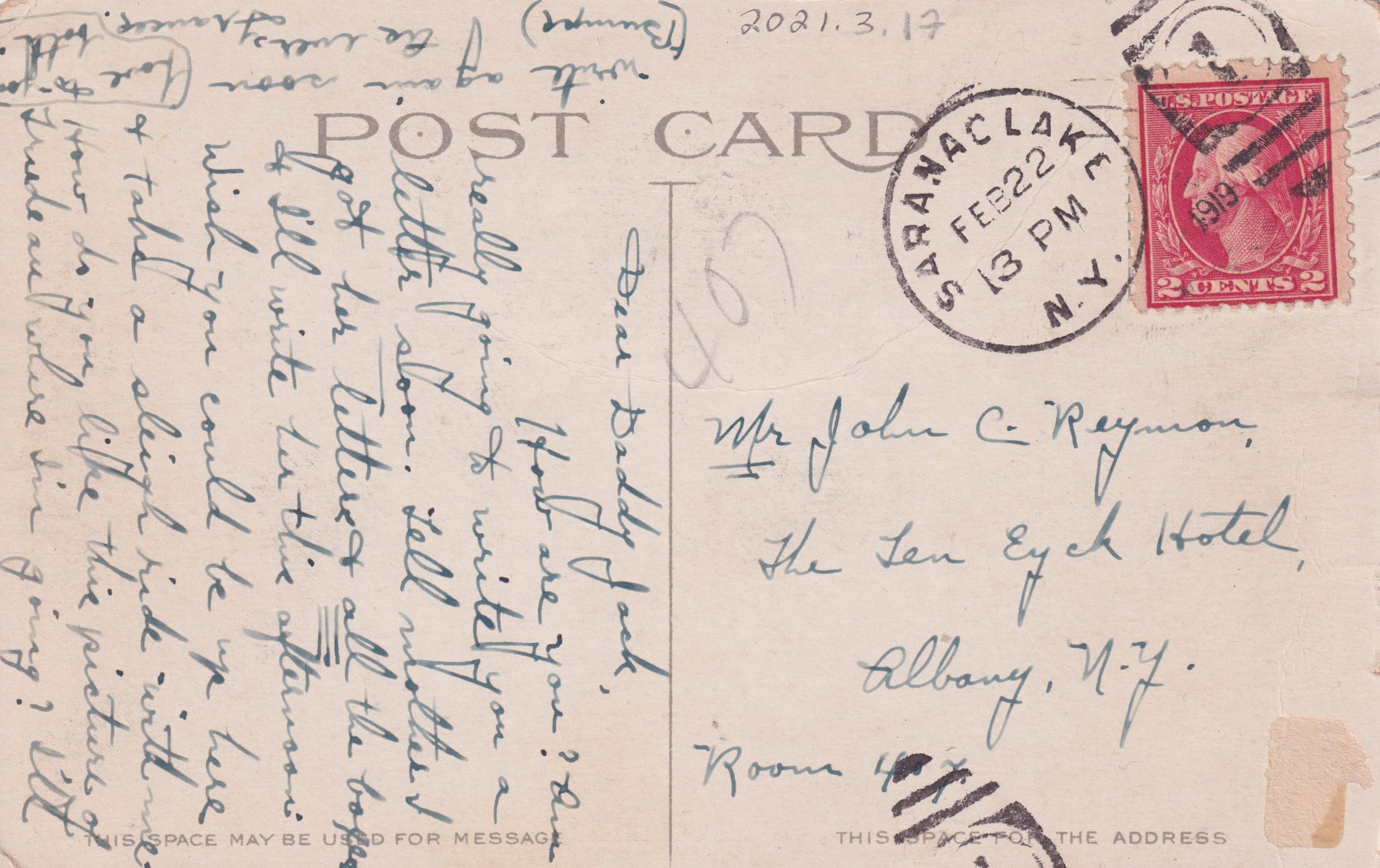 Color postcard of the south stone gate of Trudeau Sanatorium, with a boy standing by the gate and a horse-drawn wagon coming down the road. Used, divided back, white border, postmarked February 22, 1919 from Saranac Lake, NY. No publisher listed. Caption printed on front reads, "Entrance to Trudeau Sanatorium, Saranac Lake, Adirondacks, N.Y." Handwritten message on back reads, "Dear Daddy Jack, How are you? I'm really going to write you a letter soon. Tell mother I got her letter and all the boxes and I'll write her this afternoon. Wish you could be up here and take a sleigh ride with me. How do you like this picture of Trudeau where I'm going. I'll write again soon this week. As ever, Frances. Love to you both. Bumps [?]." Mailed to John C. Reymon, The Ten Eyck Hotel, Albany, NY, Room 407.Subject Place