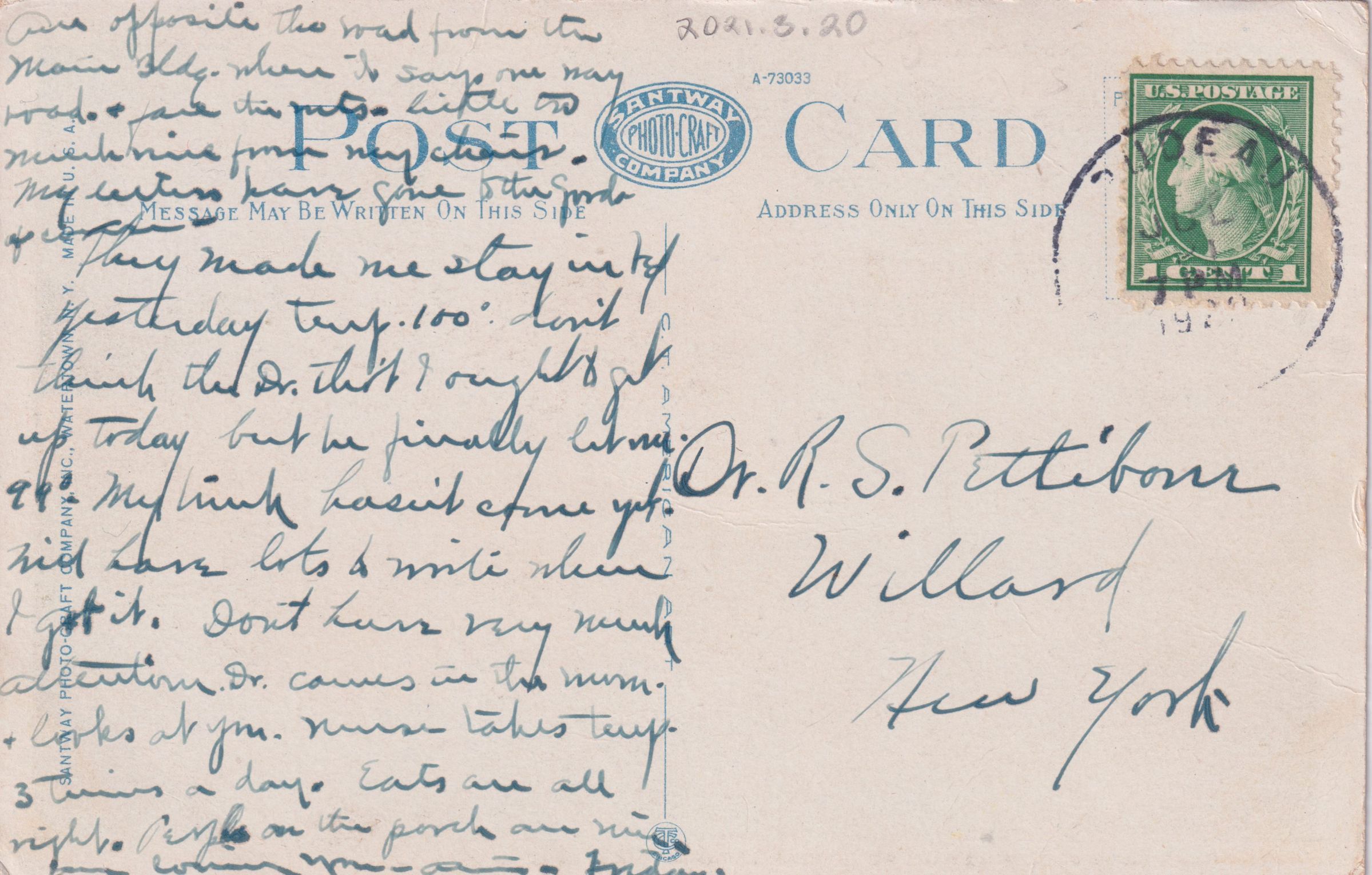 Color postcard of Mt. Baker across the Saranac River from the Bloomingdale Road. An unidentified house is visible among the trees. Used, divided back, white border, postmarked July [?], 1922. Printed by Santway Photo - Craft Company, Inc. Watertown, NY. Caption printed on front reads, "Mt. Baker from Bloomingdale Road near Saranac Lake, N.Y." Handwritten message on back reads, "They made me stay in bed yesterday, temp 100, don't think the Dr. thot [sic] I ought get up today but he finally let me. My trunk hasn't come yet. Will have lots to write when I get it. Don't have very much attention. Dr. comes in the morn and looks at you. Nurses takes temp 3 times a day. Eats are all right. People on the porch are nice. [Illegible], Friday. Am opposite the road from the Main Bldg where it says one may [illegible] & [illegible] the mts. little too much [illegible] from my chair. My [illegible] have gone [illegible] goods of [illegible]." Mailed to Dr. R. S. Pettibone, Willard, New York.Subject Place