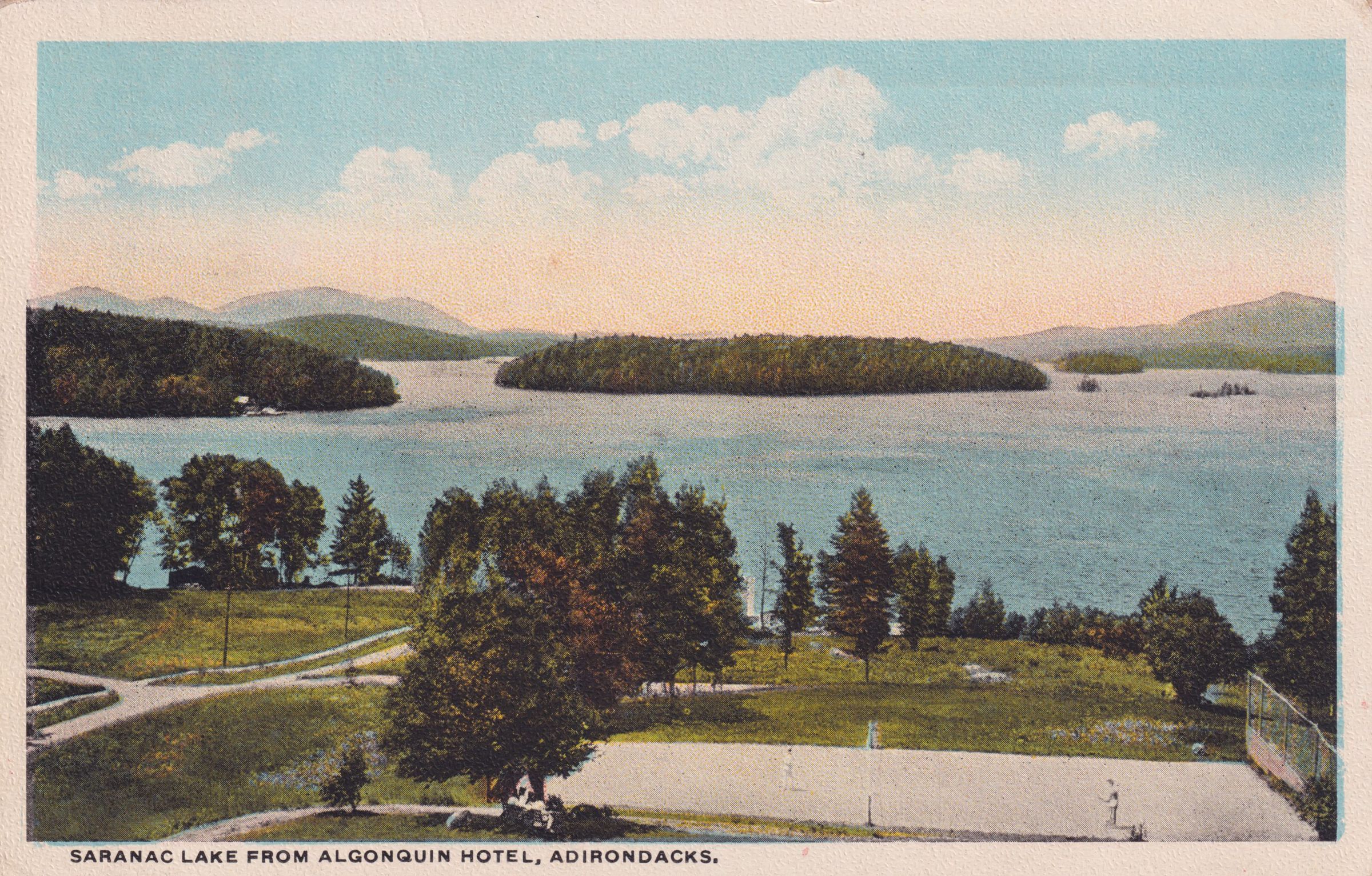 Color postcard of Lower Saranac Lake from the Algonquin Hotel. The tennis courts are visible in the foreground. Used, divided back, white border, postmarked December 19, 1922. Printed by Santway Photo - Craft Company, Inc. Watertown, NY. Caption printed on front reads, "Saranac Lake from Algonquin Hotel, Adirondacks." Handwritten message on back reads, "Am at the San since Thursday. Am surviving the ordeal fairly well. Will write you when they get through punching needles in my arms. Most sincerely, J.M." Mailed to Mrs. R. S. Pettibone, Willard, N. Y.Subject Place