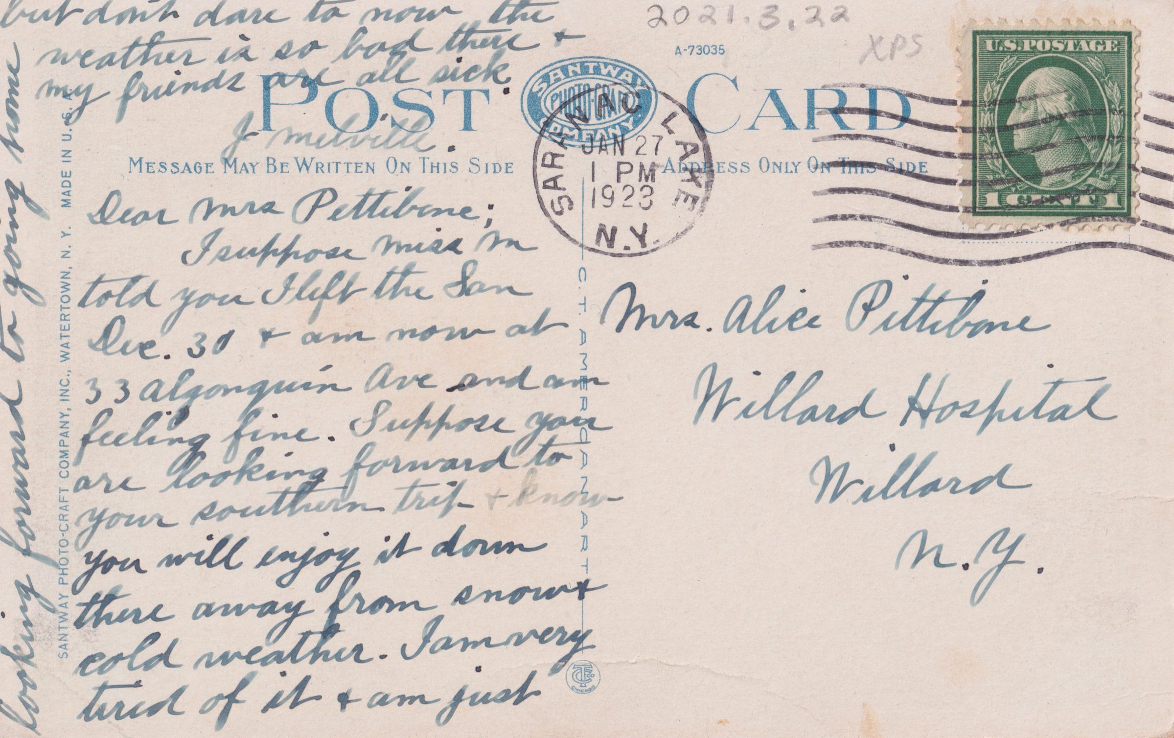 Color postcard of the Saranac River with Whiteface in the background. Used, divided back, white border, postmarked January 27, 1923. Printed by Santway Photo - Craft Company, Inc. Watertown, NY. Caption printed on front reads, "Saranac River and Whiteface Mt. from Bloomingdale Road, Adirondacks." Handwritten message on back reads, "Dear Mrs. Pettibone, I suppose Miss M told you I left the San Dec. 30 and am now at 33 Algonquin Ave and am feeling fine. Suppose you are looking forward to your southern trip and know you will enjoy it down there away from snow and cold weather. I am very tired of it and am just looking forward to going home but don't dare to now the weather is so bad there and my friends are all sick. J. Melville." Mailed to Mrs. Alice Pettibone, Willard Hospital, Willard, N.Y.Subject Place