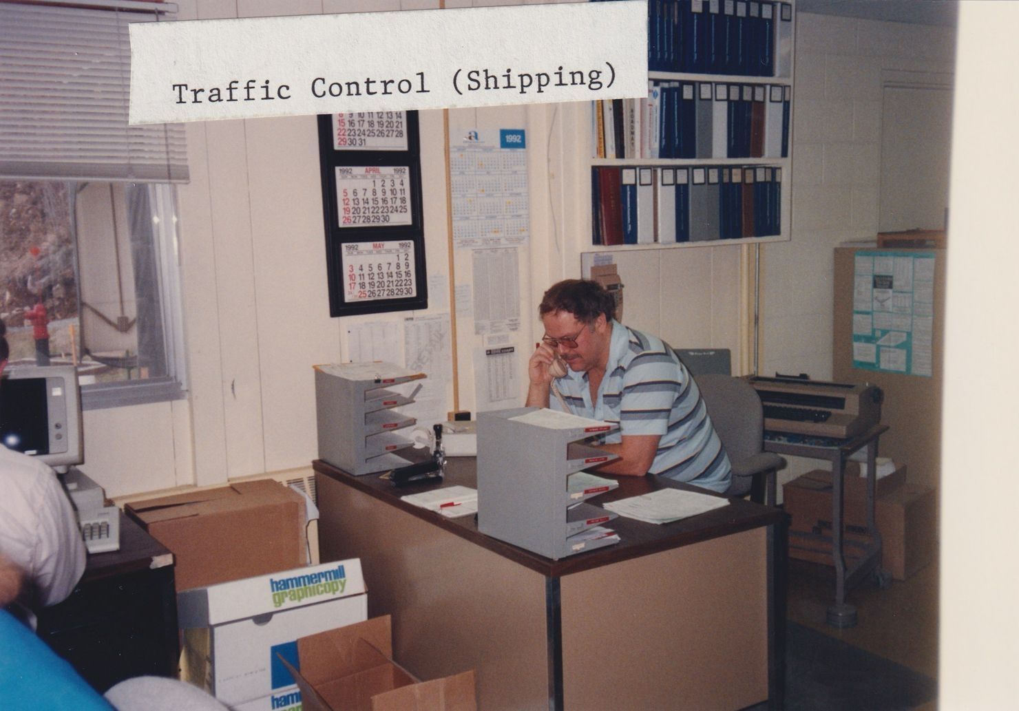 Color photograph of a man sitting at a desk talking to someone on a phone. There are multiple calendars on his wall and two organizational trays on his desk. There is a label affixed to the front of the photograph that has "Traffic Control (Shipping)" typewritten on it. This photograph is from an album of photographs taken at the American Management Association.
